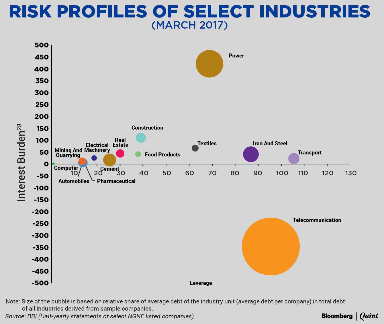 A risk profile of select industries, at the end of March 2017, showed that the telecommunications industry had the largest debt with negative profitability, the RBI said. The industry also had relatively high leverage. The power, construction and iron and steel industries suffered from relatively high leverage and high interest burden, it added.