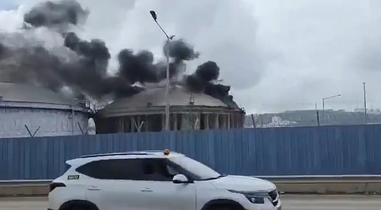 Video clips widely shared online show flames engulfing a large storage tank at the Bazan oil refinery, with thick black smoke billowing into the sky.