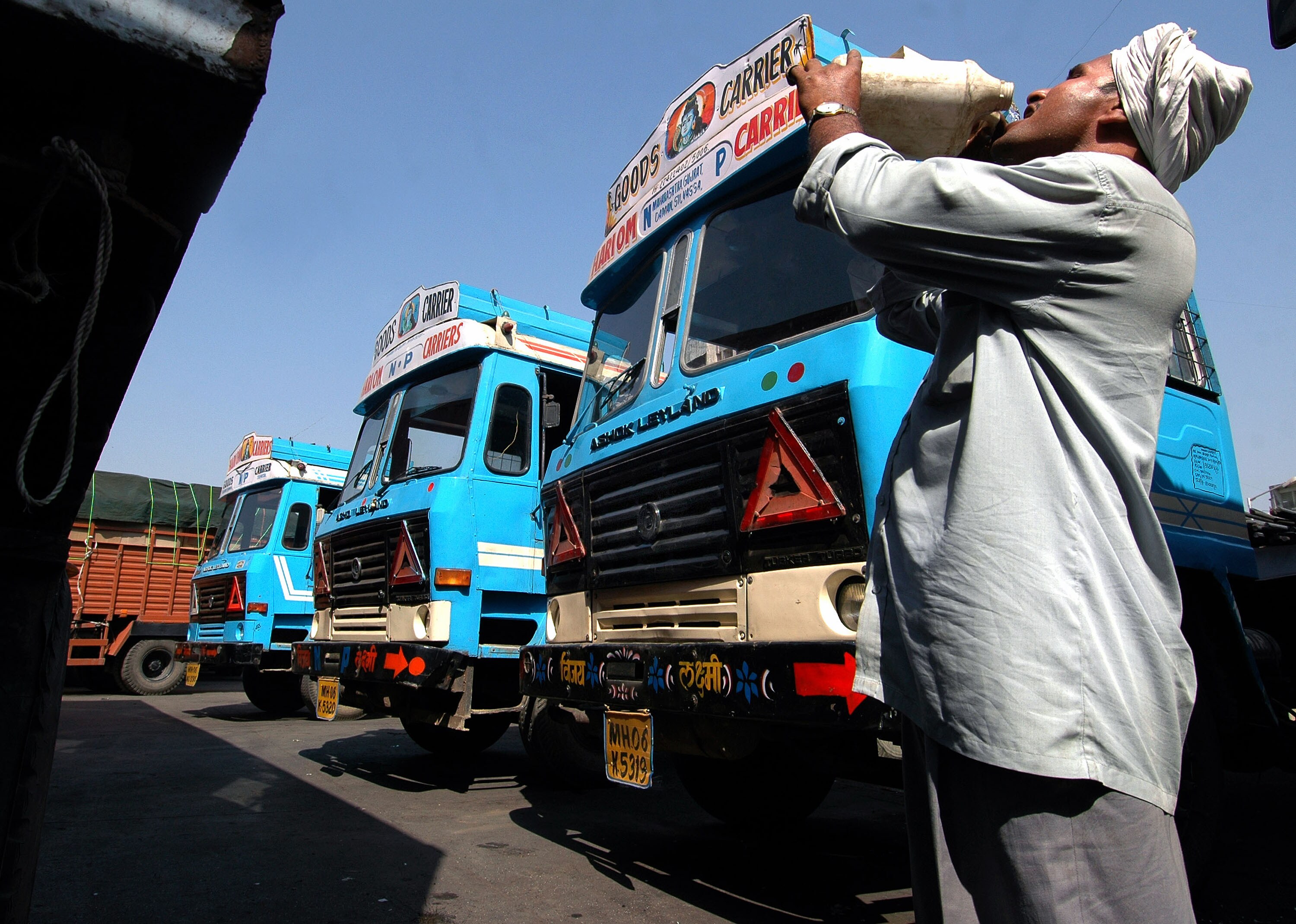 A truck driver drinks water in front of a line of goods-carrier trucks parked at a toll plaza in Mumbai, India. (Photographer: Abhijit Bhatlekar/Bloomberg News)