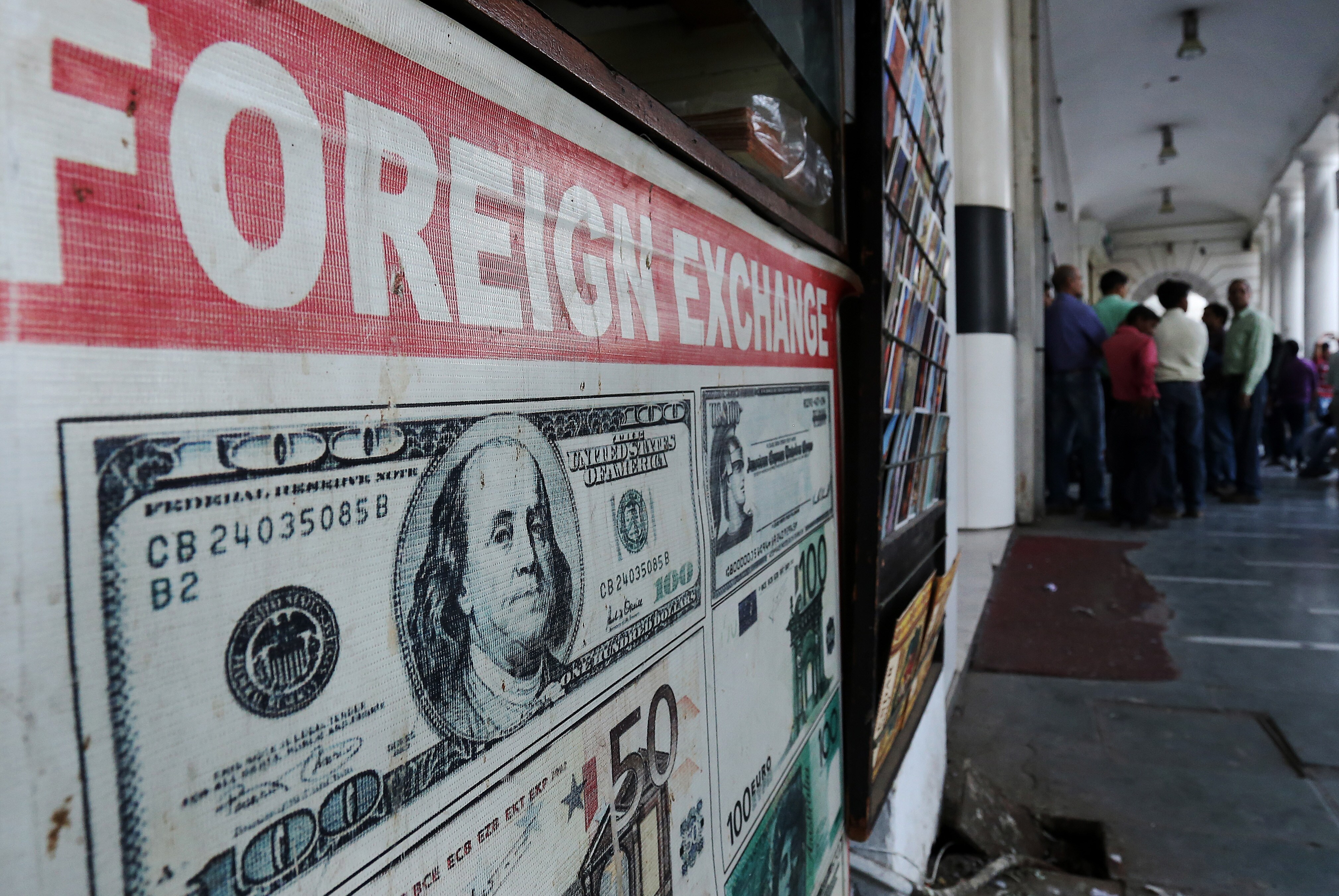 A poster depicting a U.S. one hundred dollar banknote is displayed at a currency exchange booth in New Delhi. (Photographer: Anindito Mukherjee/Bloomberg)