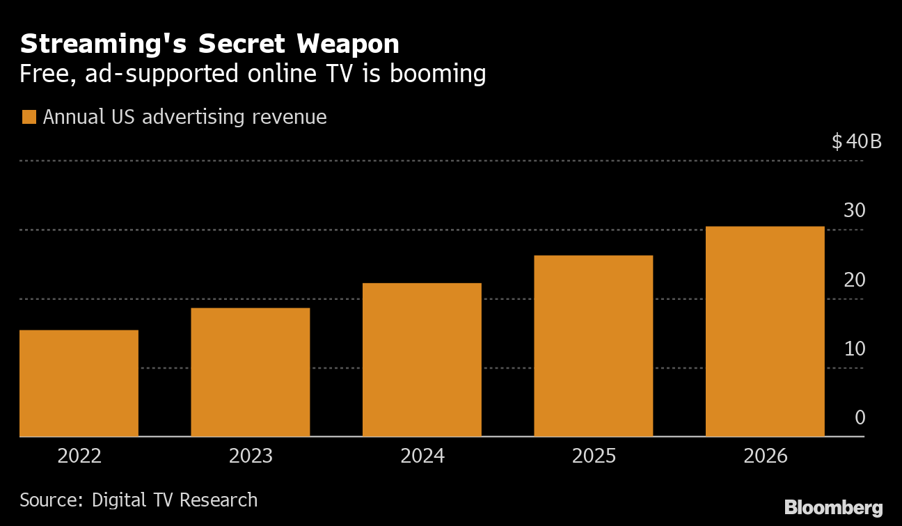 Revenue at Tubi and other advertising-based video-on-demand, or AVOD services, such as Paramount Global's Pluto, Roku and Amazon.com Inc.'s Freevee, is expected to double to $30 billion in the US by 2026, according to Digital TV Research.