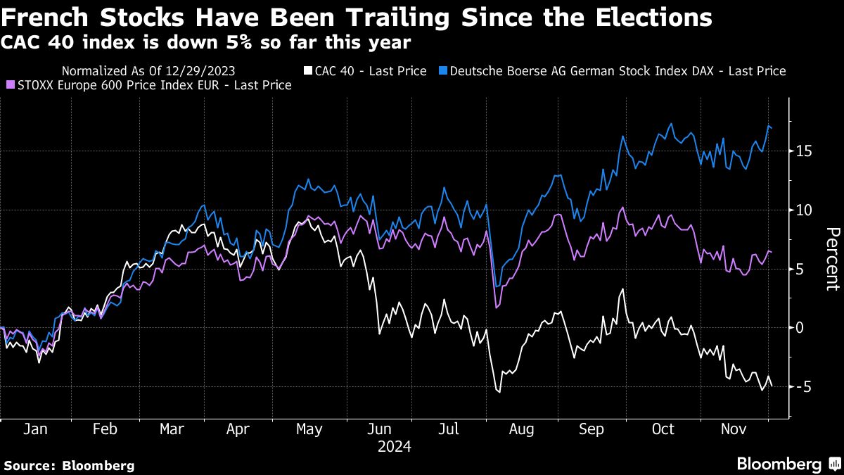 Investors have fretted for months over France's political difficulties, just as the government has been trying to push measures that will reduce its unwieldy deficit. The budget bill initially presented by Barnier's government contained €60 billion ($63 billion) of tax increases and spending cuts that aimed for a sharp adjustment in the deficit to 5% of economic output in 2025 from an estimated 6.1% this year.