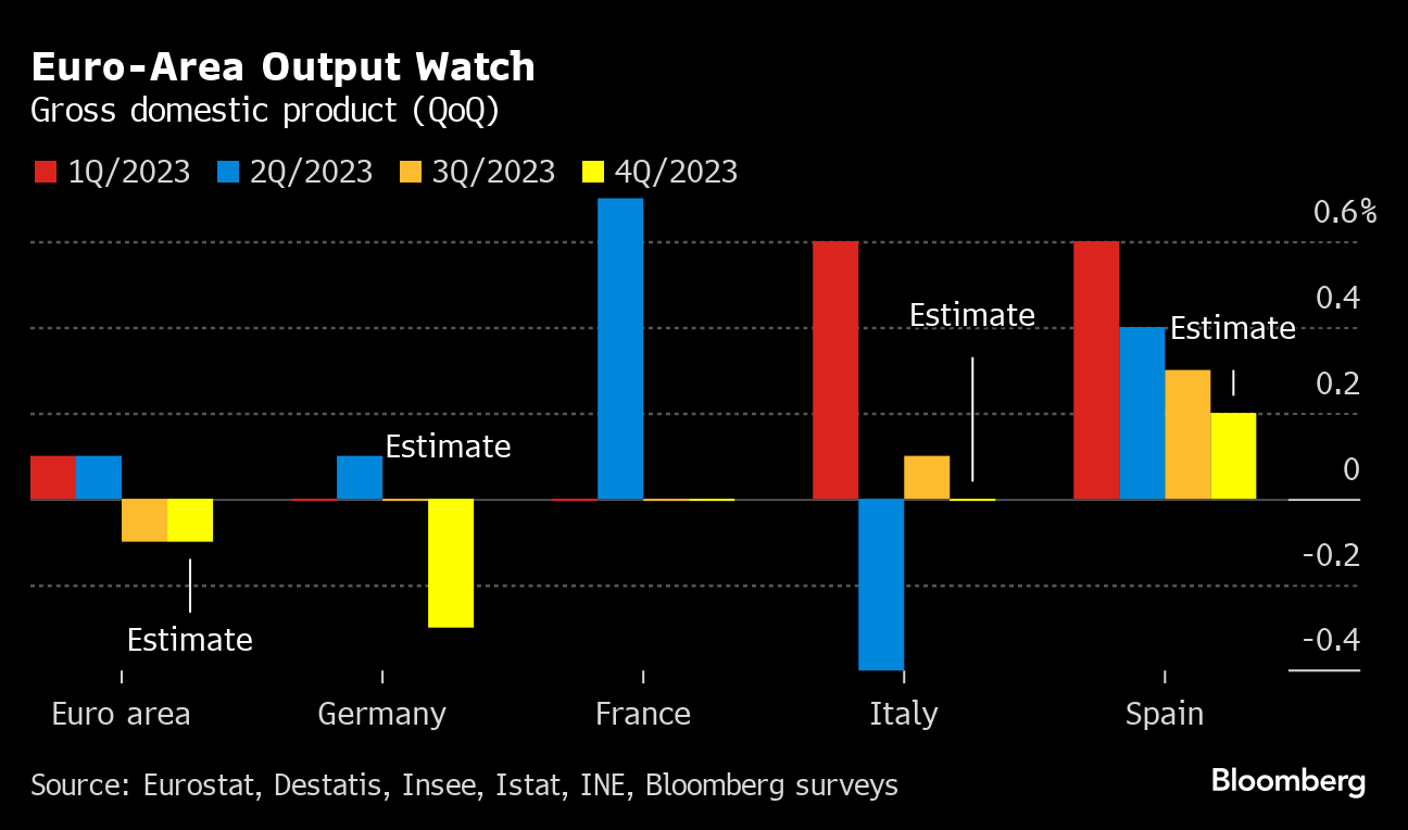 The data kick off a marathon day of GDP numbers from the euro area, capped by a reading for the 20-nation bloc itself that analysts reckon will confirm a first recession since the pandemic. It would only be shallow, though — not enough to hasten the prospect of interest-rate cuts by the European Central Bank.