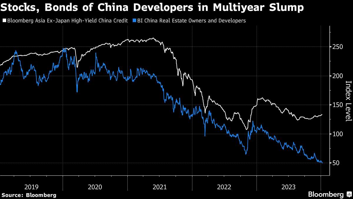 The stocks and bonds of Chinese real estate companies have been pummeled over the past four years due to a toxic cocktail of unsustainable debt levels, slowing long-term economic growth, and spreading disinflation. A Bloomberg index of real estate owners and developer shares has tumbled almost 80% since the end of 2019, while a gauge of high-yield China dollar bonds dominated by developers slumped 45% over the same period.