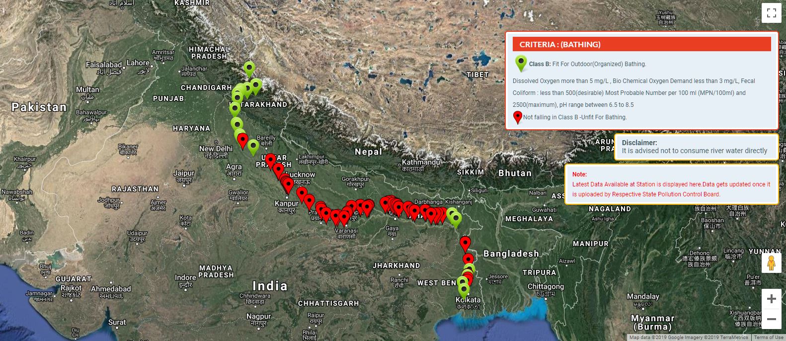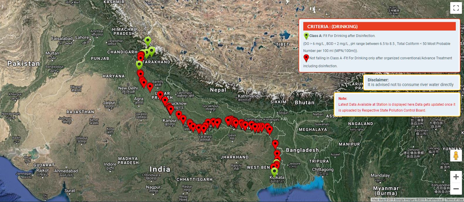 Some stretches in Uttarakhand and two spots in West Bengal are marked in green indicating water can be consumed after disinfection while the rest of the river water is unfit for drinking or bathing the whole way till it drains into the Bay of Bengal.