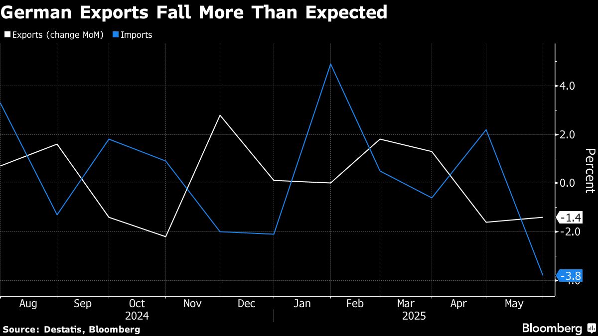 German exports sank more than anticipated in May as the value of shipments to the US plunged to their lowest level in more than three years amid President Donald Trump's tariff threats.