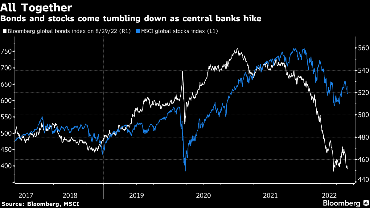 It's a particularly difficult environment for investors, with bonds and stocks sinking in tandem this year. MSCI Inc.'s index of global equities has lost 16% so far this year on a total return basis. The Bloomberg bond gauge lost 19.3% as of Monday from its record high in January 2021.
