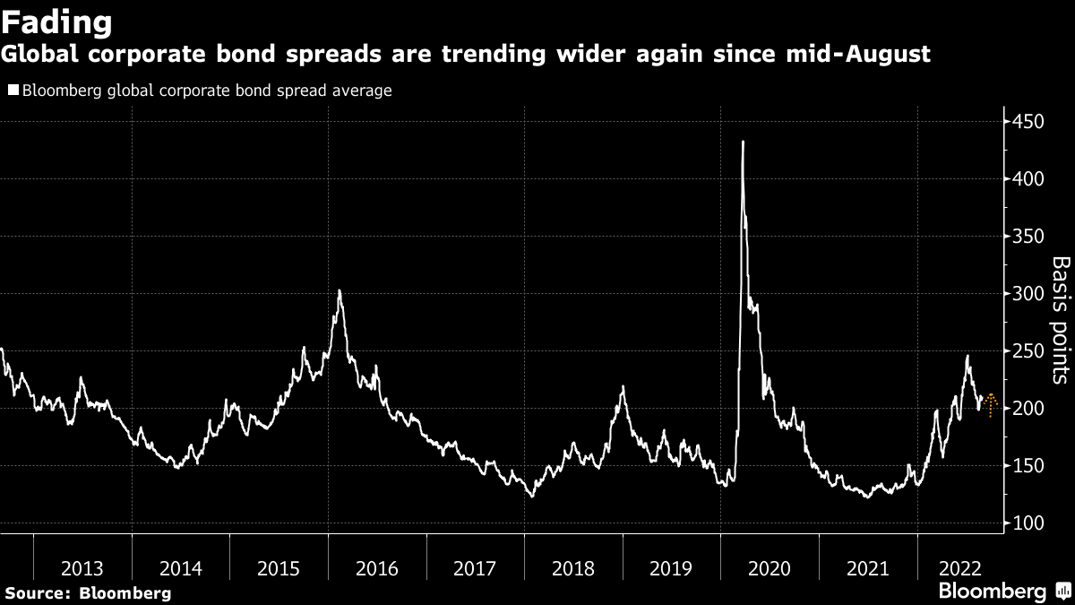 Corporate bond spreads globally are also widening after the summer rally, and were higher again at the start of the week, a Bloomberg index shows. They have climbed for two straight weeks, the data show.