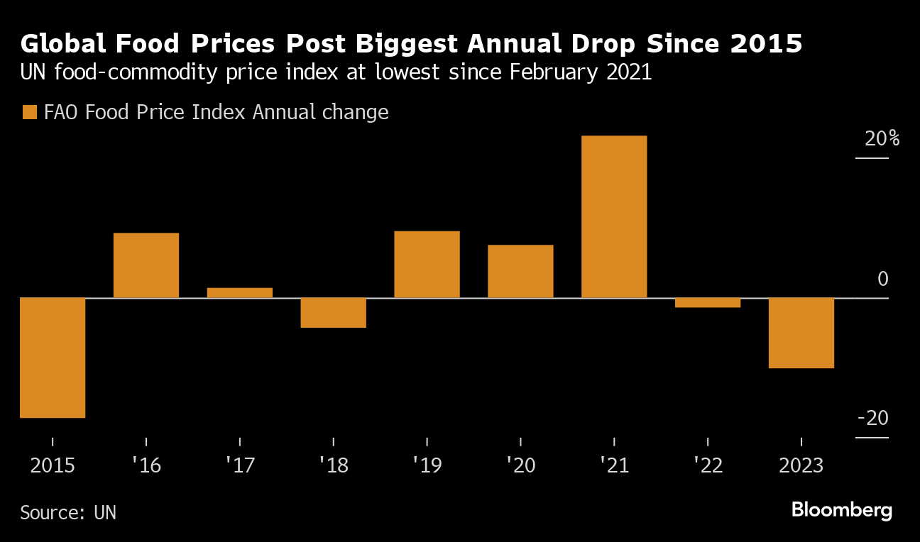 (Bloomberg) -- Global food prices posted the biggest annual drop since 2015, amid signs that lower wholesale food prices are starting to feed through to supermarket shelves.