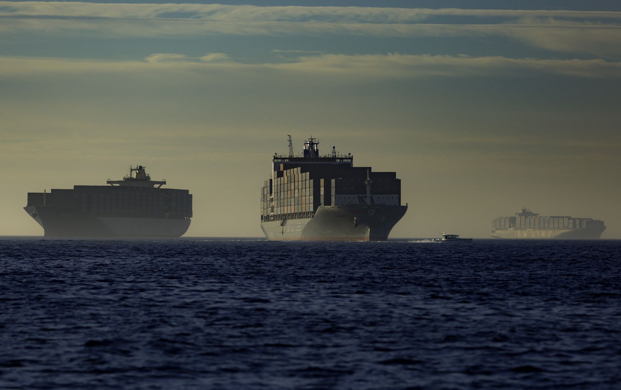 Container ships at anchor outside the Port of Los Angeles in Los Angeles, California, U.S., on Sunday, Nov. 21, 2021. Shipments to the Port of Los Angeles fell 8% year over year in October. Photographer: Tim Rue/Bloomberg
