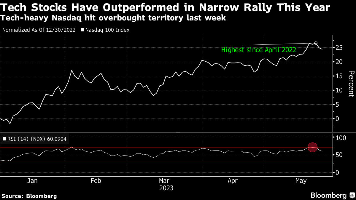 The recovery in US equities this year has been led by a small group of tech giants as investors shifted toward companies with strong earnings potential and exposure to artificial intelligence, and away from economically sensitive cyclical industries. The Nasdaq 100 Index is up 24% and set for its best start to a year since 1998. It's a sharp contrast to 2022, when the tech-heavy benchmark posted its worst loss since the 2008 global financial crisis amid rising rates and concerns about profits.
