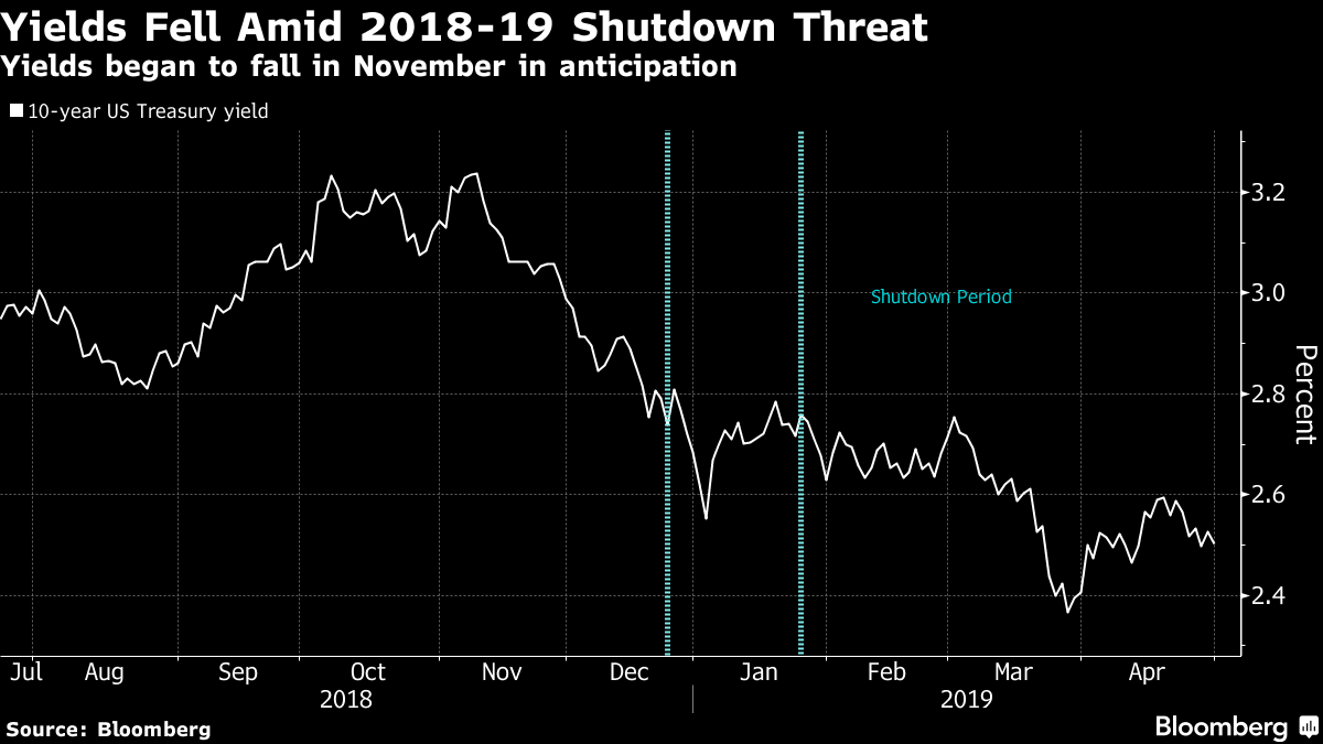 In 2018, a shutdown began that lasted 35 days after President Donald Trump and Congress reached an impasse over border wall funding. Fears of a recession again caused convulsions in the bond markets. While the shutdown began in December, yields fell in anticipation beginning in November amid Trump's shutdown threats.