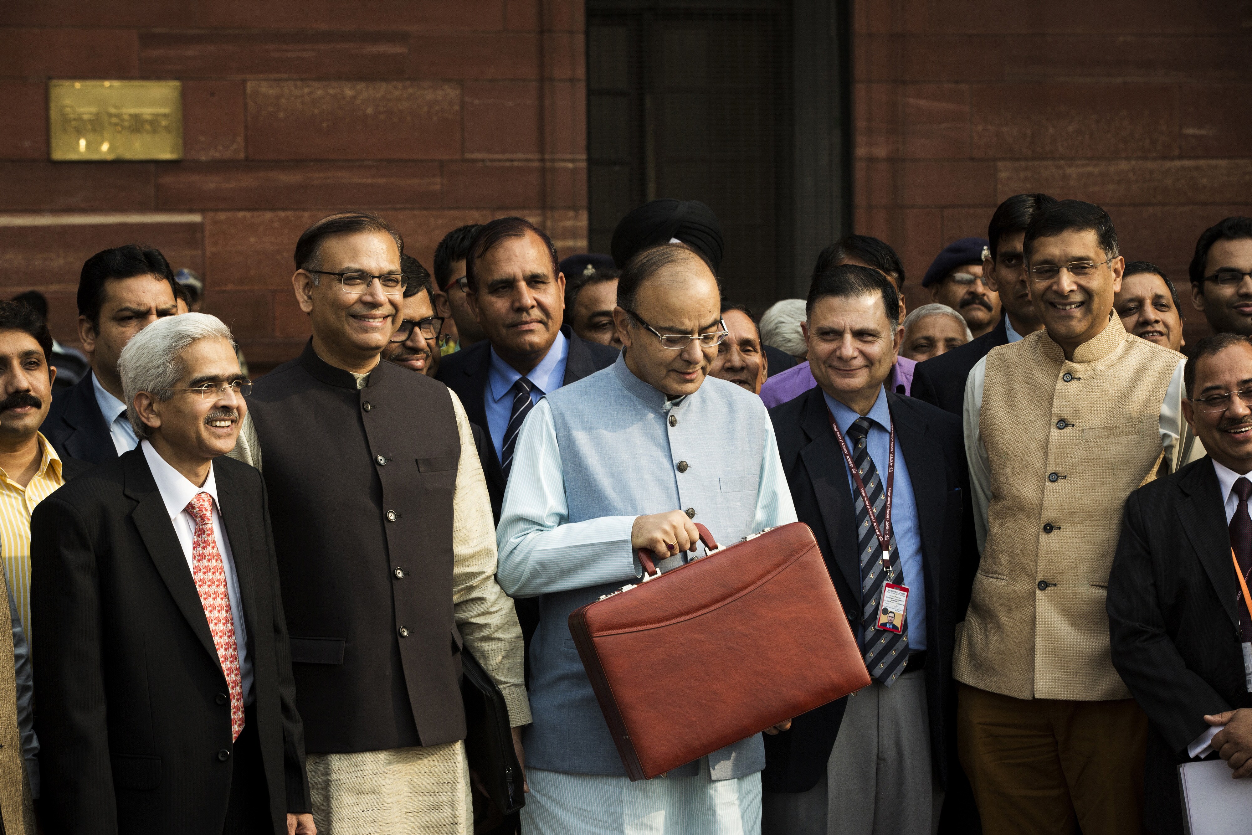Finance Minister Arun Jaitley poses for a photograph with other ministry officials before presenting the Budget on February 29, 2016. (Photograph: Udit Kulshrestha/Bloomberg)