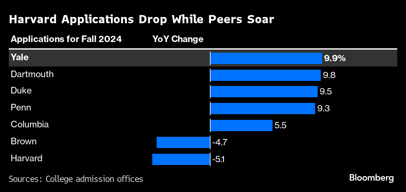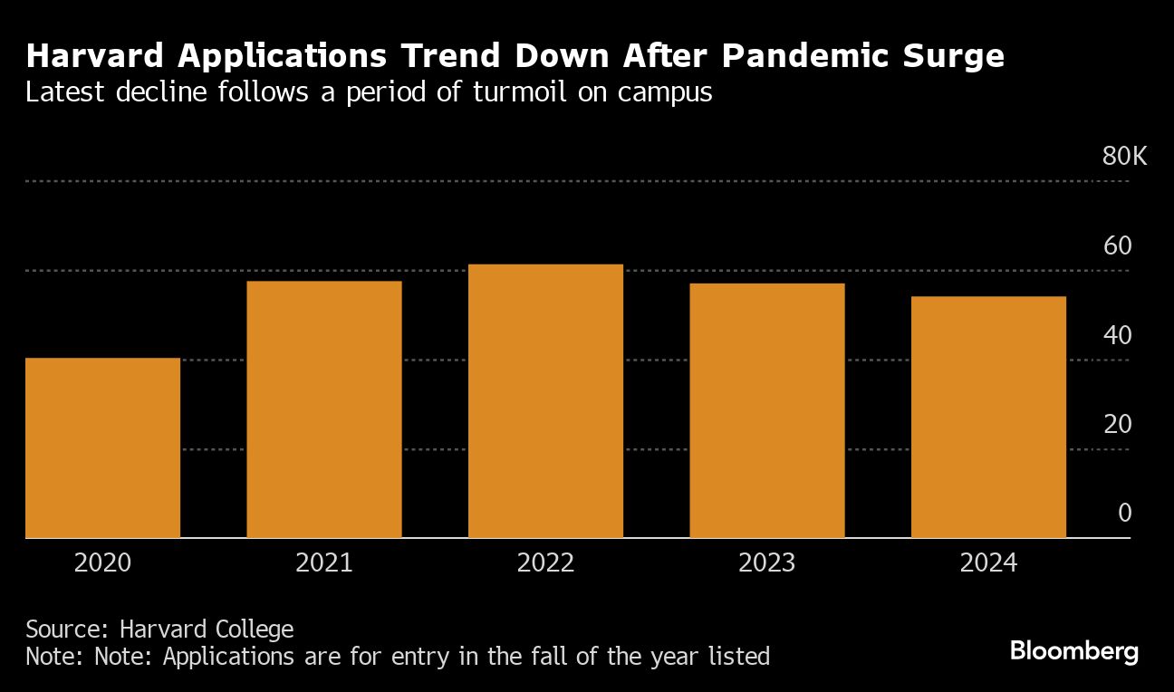 (Bloomberg) -- Applications to Harvard College fell 5% from a year ago after a tumultuous period that included the resignation of its president and a defeat at the Supreme Court.