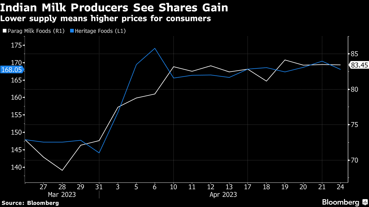 Further west, India's hottest February in more than a century, following a spike in cattle deaths caused by a viral skin disease, fueled a rare drop in dairy production in the world's largest milk-producing nation. With more heat waves forecasts alongside peak summer demand, shares of dairy firms such as Parag Milk Foods Ltd. and Heritage Foods Ltd. are soaring.