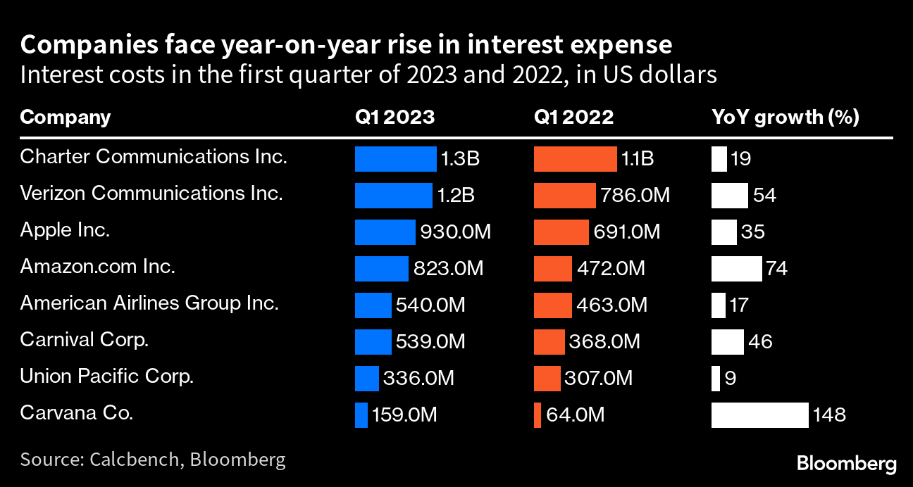 Electronics giant Apple Inc. and telecom provider Verizon Communications Inc. are among the corporations that have seen their interest costs surge. In the case of Verizon, interest expense soared to $1.21 billion in the first quarter from $786 million in the same period a year earlier. ย