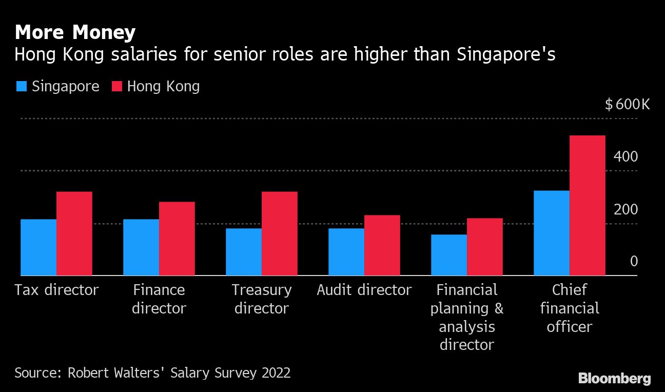 In terms of salaries, Hong Kong still shines. Wages for director and chief officer-level positions are more than 60% higher in Hong Kong, compared with Singapore, according to data compiled by Bloomberg from a 2022 survey by recruitment firm Robert Walters Plc.