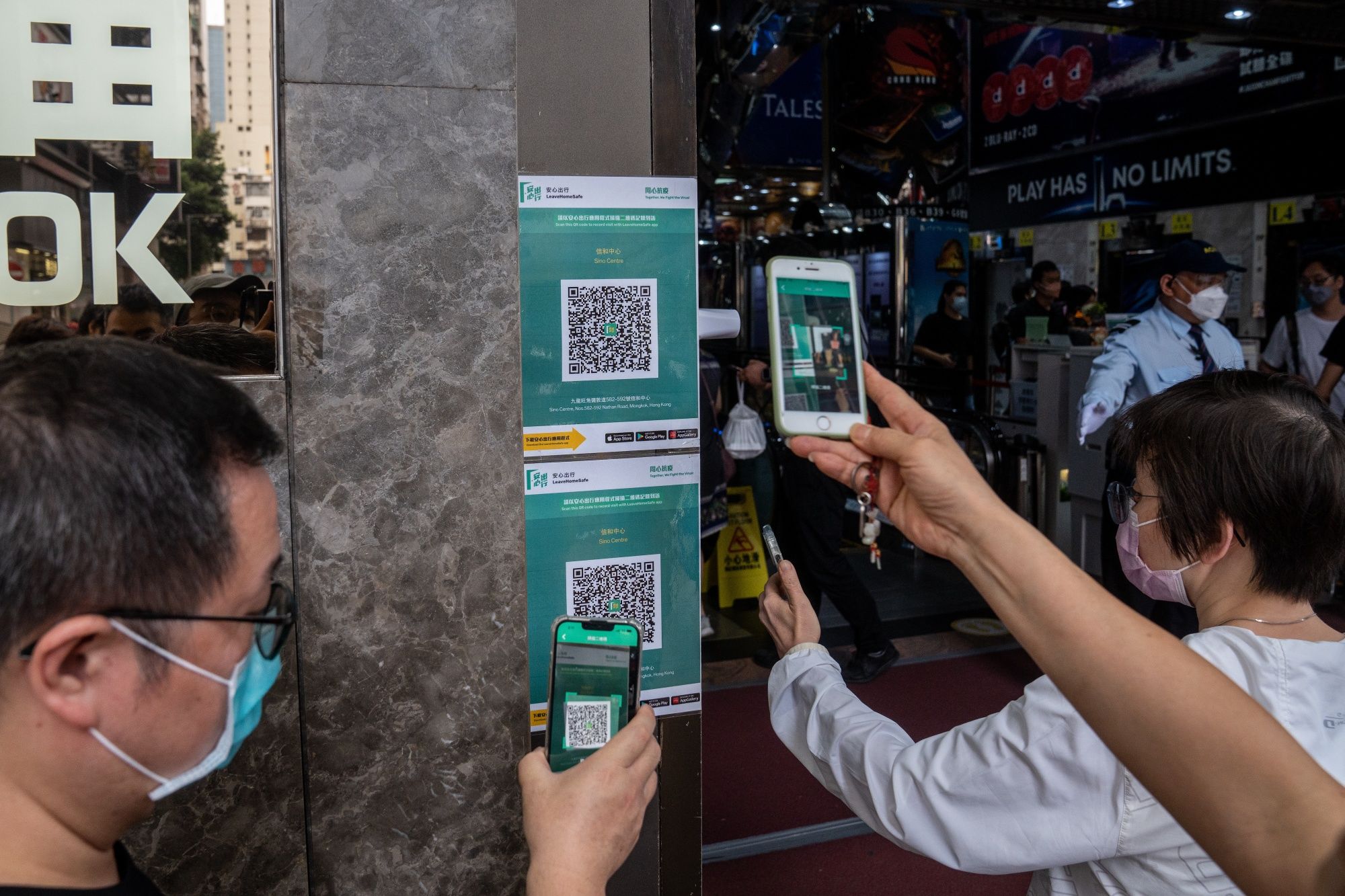 Visitors scan a QR code for the LeaveHomeSafe Covid-19 contact-tracing app before entering a shopping mall. Photographer: Chan Long Hei/Bloomberg