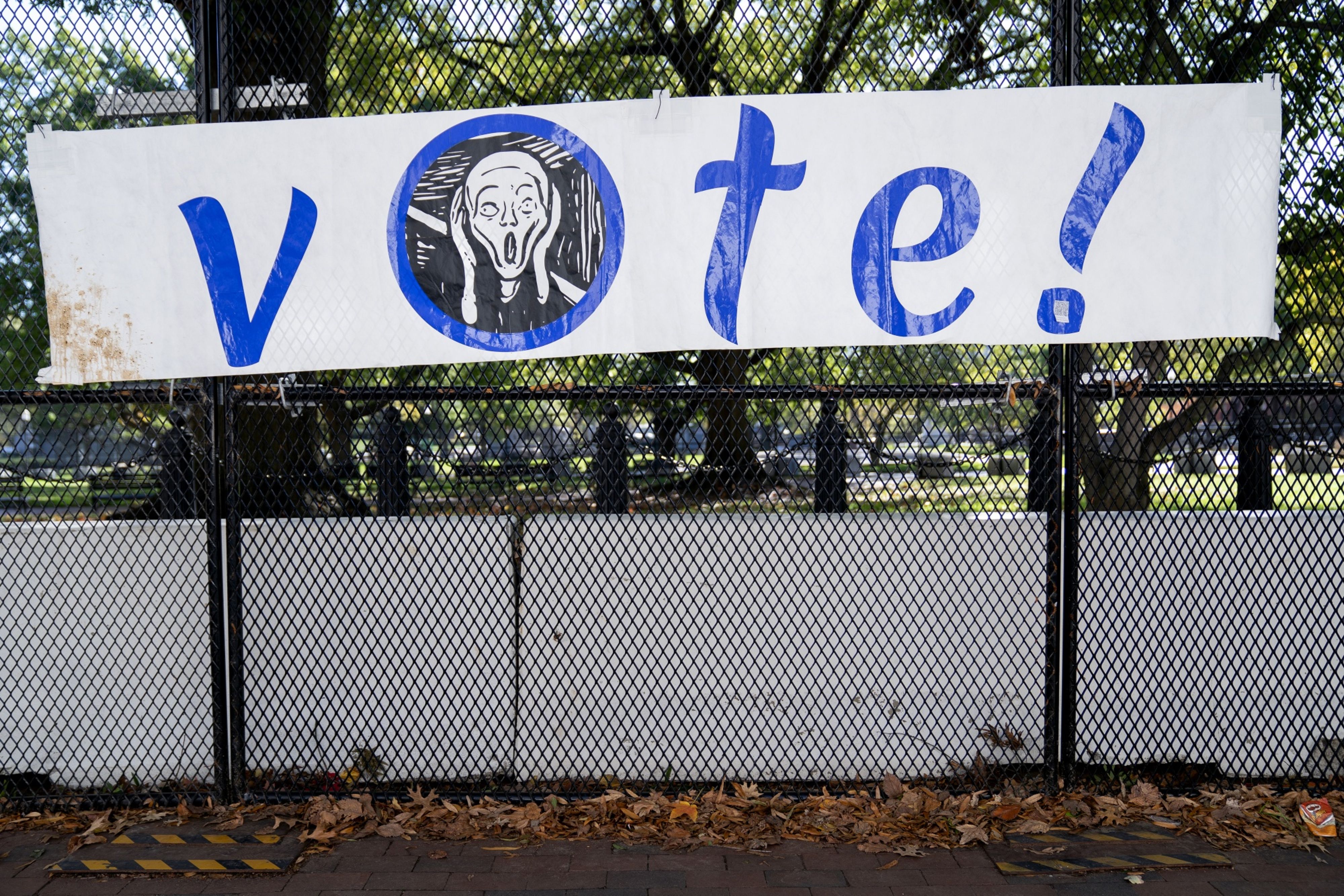 A “Vote!” sign on fencing around Lafayette Square near the White House in Washington, D.C., U.S., on Monday, Nov. 2, 2020. (Photographer: Stefani Reynolds/Bloomberg)
