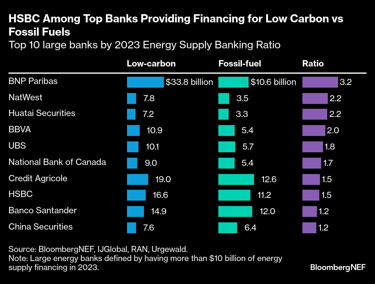 For now, banks aren't close to the 4-to-1 ratio of green-to-brown capital allocations that BloombergNEF says is needed if the industry is to align its business with the goal of limiting warming to 1.5C. At the end of 2023, the industry's so-called energy-supply banking ratio, which includes debt and equity underwriting, was 0.89 to 1, BNEF said in January. HSBC performed better than the industry average, with a ratio of 1.49, BNEF estimates.