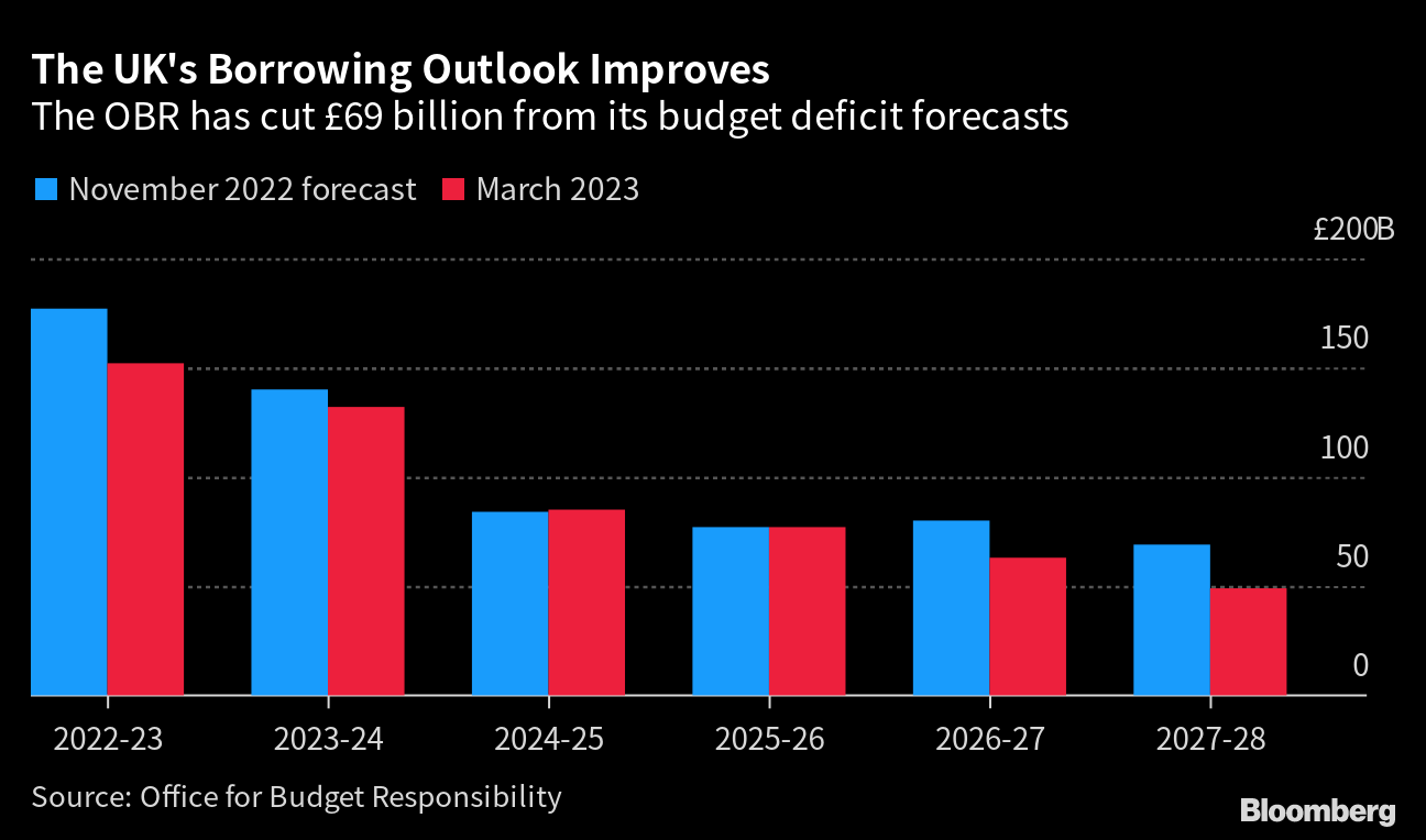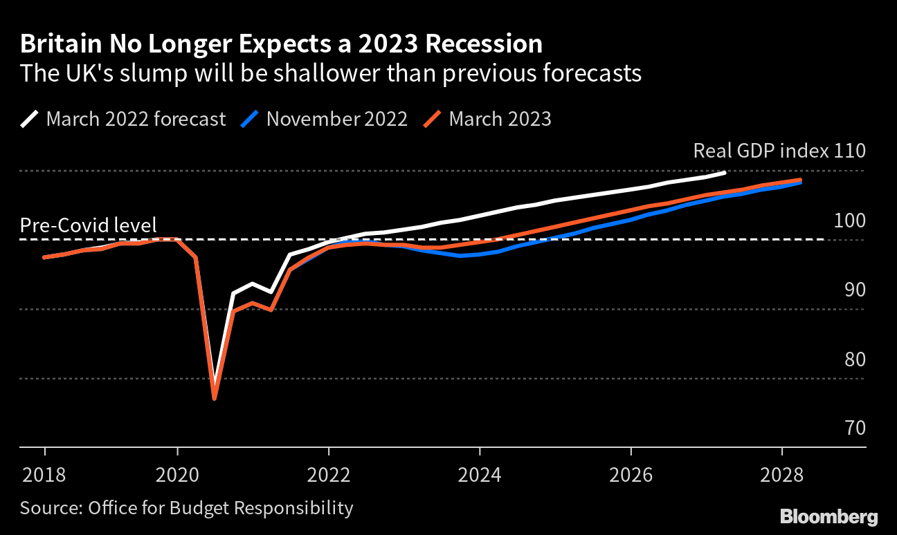 Hunt said the economy would only contract by 0.2% in 2023, compared to the OBR's previous forecast of shrinking by 1.4%. The average of independent forecasts had expected a 0.7% decline.