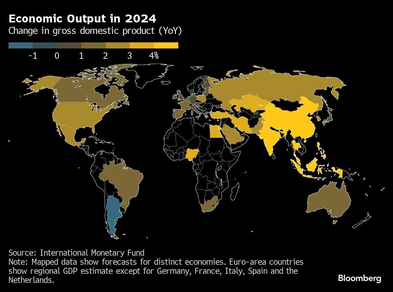 Argentina was slashed to a 2.8% contraction this year, from the previous estimate of a 2.8% expansion made in October, before the election of President Javier Milei. The IMF cited a “significant policy adjustment” under his new government, which so far has included eliminating subsidies and price controls, devaluing the currency by more than half and proposing plans to shore up government finances.