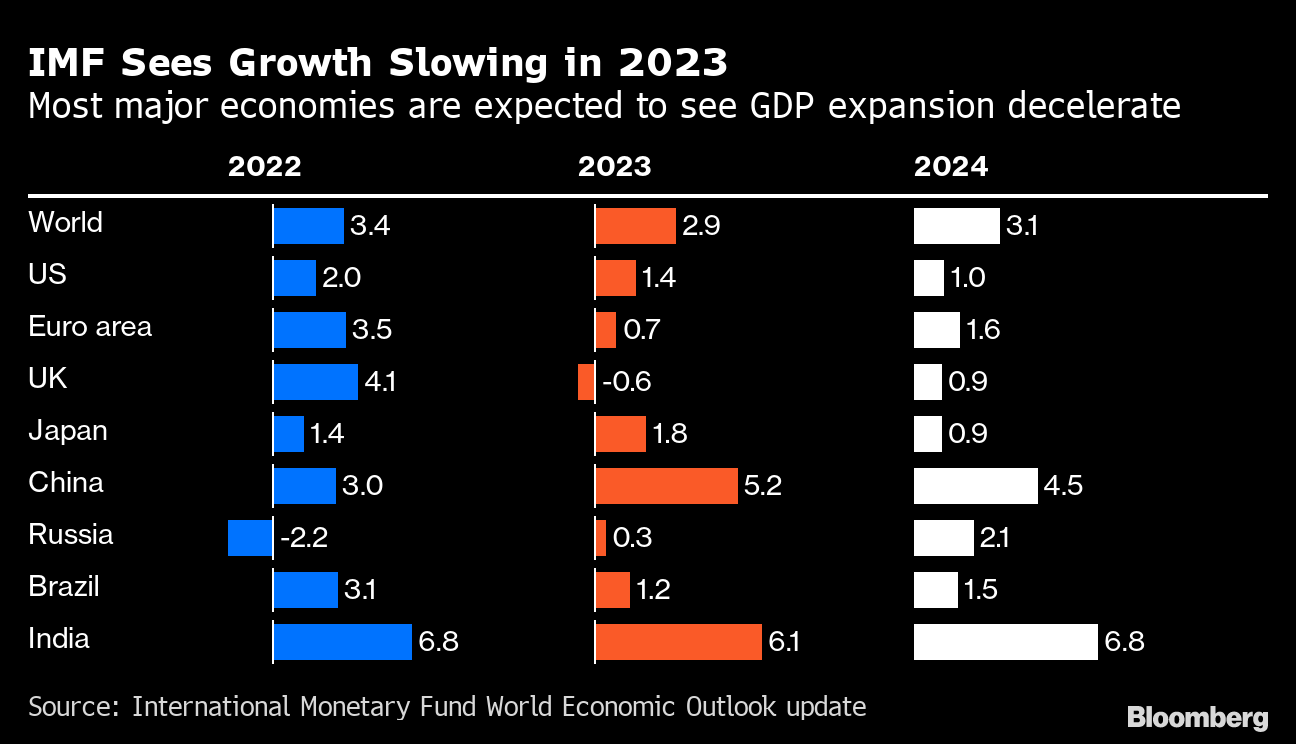 Gross domestic product will likely expand 2.9% in 2023, 0.2 percentage point more than forecast in October, the fund said Tuesday in Singapore in a quarterly update to its World Economic Outlook. While that's a slowdown from a 3.4% expansion in 2022, the IMF said it expects growth will bottom out this year before accelerating to 3.1% in 2024.