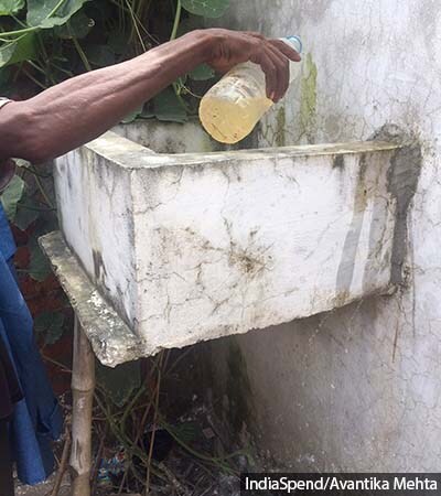 Rakwa Gulma Patti has one water pump for its 150-odd residents, and many complained that they could not extract fresh water from it. “Sometimes a fish or a rodent dies inside the well, and no one knows until the smell becomes impossible to ignore, and the colour of the water turns yellow,” Rajalaxmi, 30, said. This water is used to bathe, wash clothes and sometimes to drink and cook. “When we have money, most of us try to avoid taking water from the pump,” she said, adding that they sometimes buy bottled water from a kirana store just outside the village. “We have complained to the village head, but no one listens,” Rajalaxmi added. At the time IndiaSpend visited the village, the water extracted from the pump was a dark yellow with dirt floating on top.