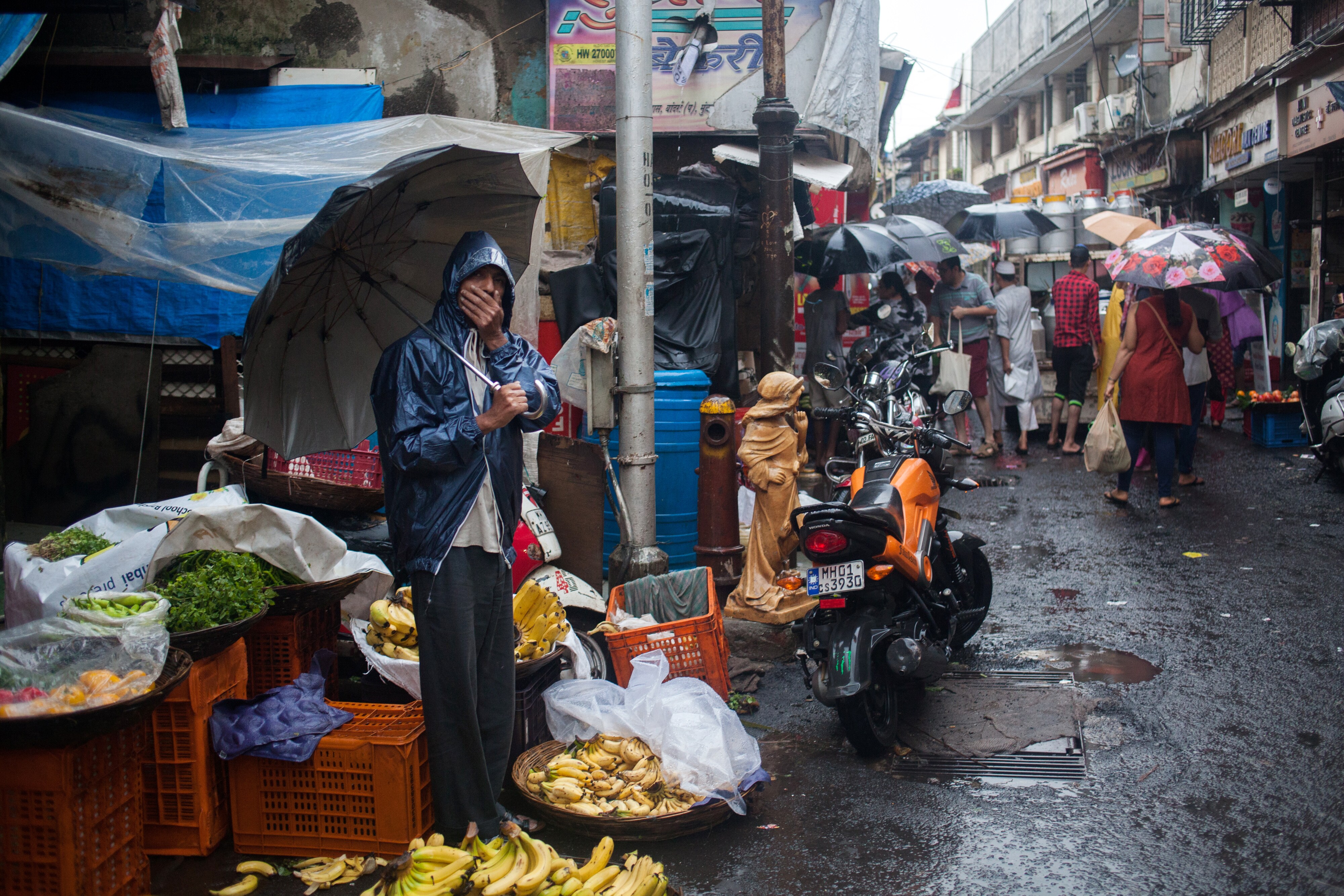 A vendor holding an umbrella waits for customers at a fruit and vegetable stall in the suburb of Bandra in Mumbai. (Photographer: Karen Dias/Bloomberg)