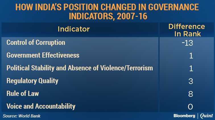 Except corruption, India's position on the World Bank's global governance indicators either worsened or remained unchanged in the 10 years leading to 2016, according to World Bank data.