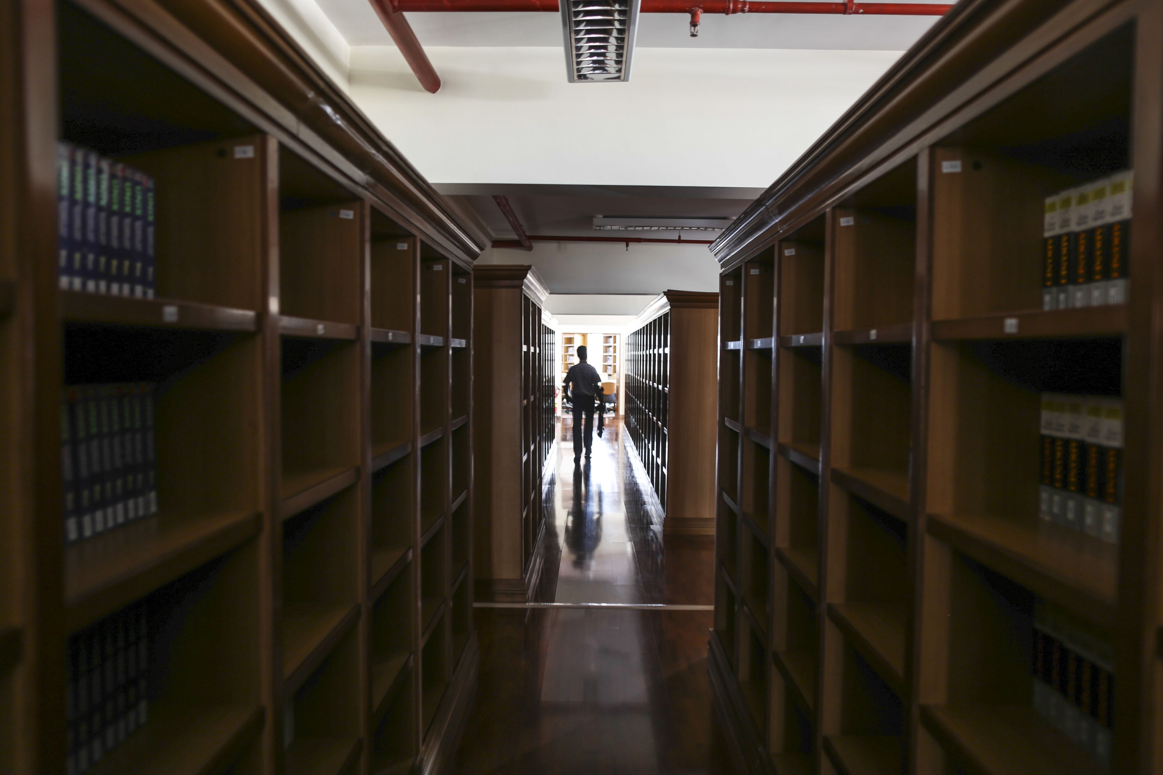 A man is silhouetted as he walks through an aisle in a library at the Infosys Ltd. Global Education Centre campus (Photographer: Dhiraj Singh/Bloomberg)