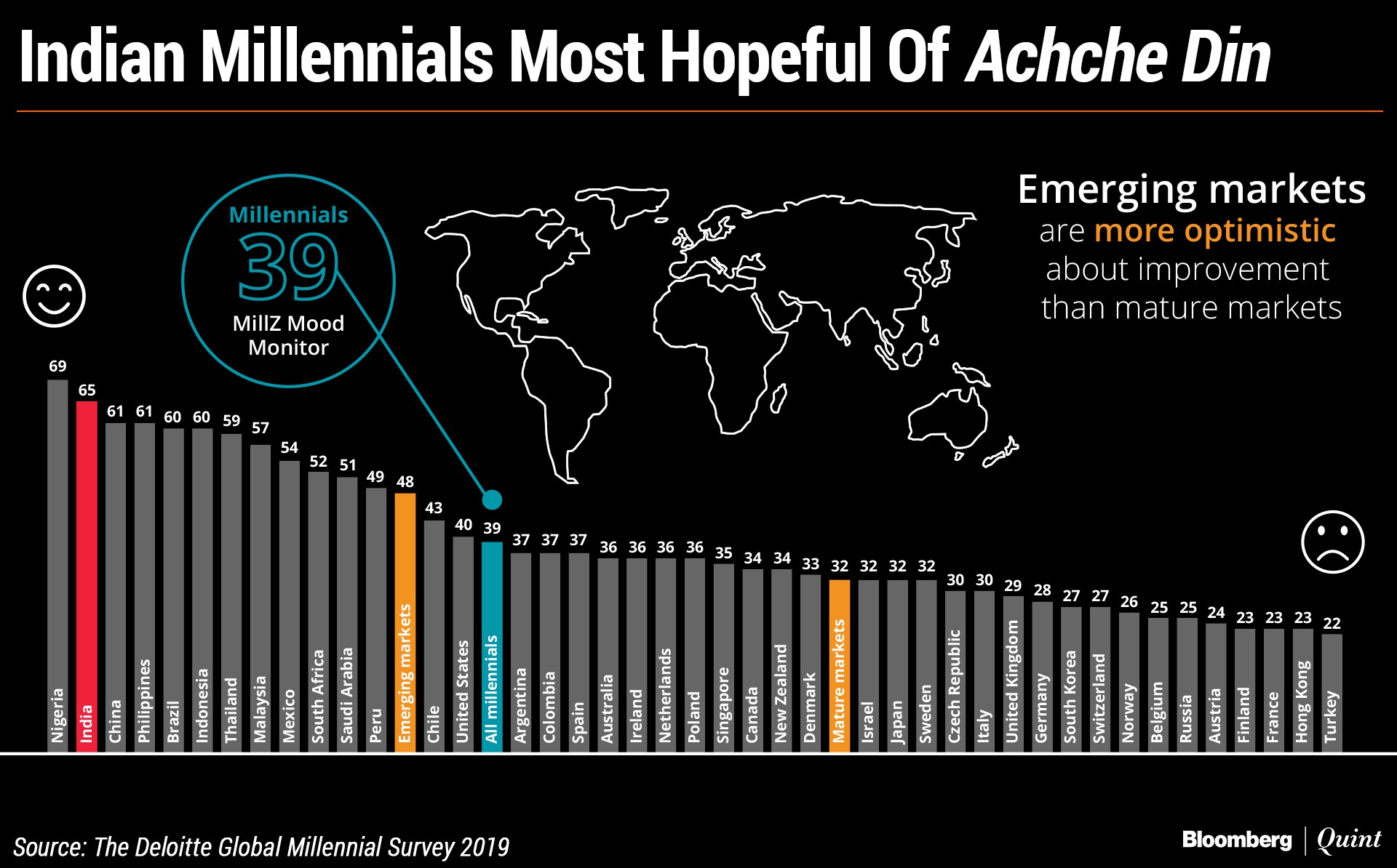 That comes at a time India's unemployment reportedly touched a 45-year high, industrial productivity fell and food prices rose. India's score of 65 on the ‘MillZ Mood Monitor' scale by Deloitte pointed to an overall optimism among citizens. The global average score was 39, where zero indicated absolute pessimism and 100 absolute optimism.