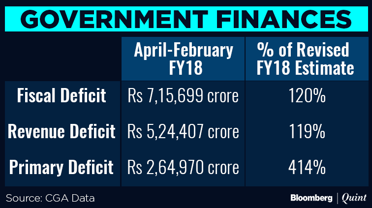 As a percentage of GDP, the government had pegged the fiscal deficit for 2017-18 at 3.5 percent compared to the earlier targeted 3.2 percent. Based on today's data, the fiscal deficit is running at 4.2 percent of GDP. That calculation is based on the nominal GDP estimates put out in the economic survey, which were also used in the budget calculations this year.