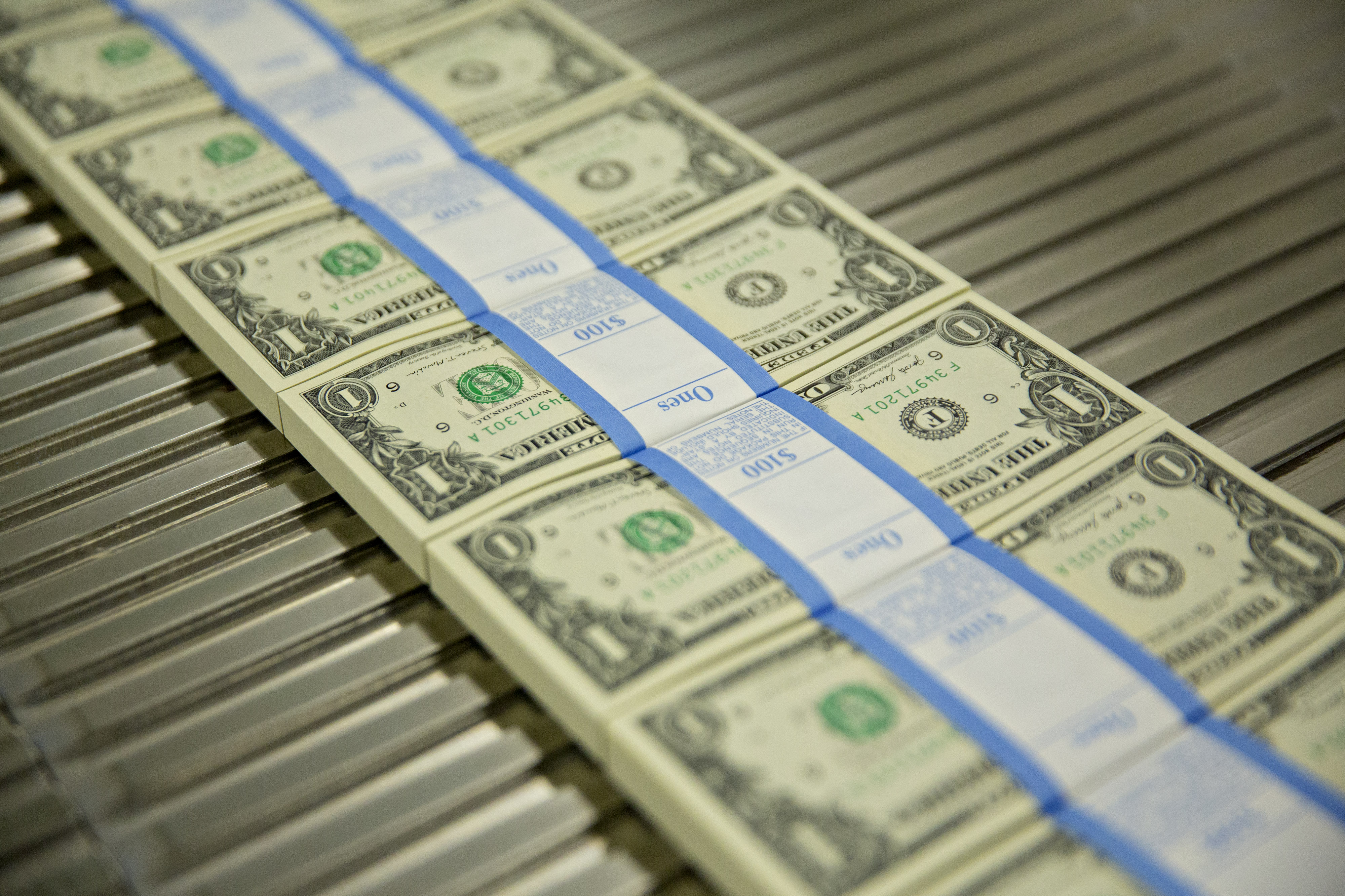 Stacks of $1 dollar notes move through a machine at the U.S. Bureau of Engraving and Printing in Washington, D.C., U.S., on November 15, 2017. (Photographer: Andrew Harrer/Bloomberg)