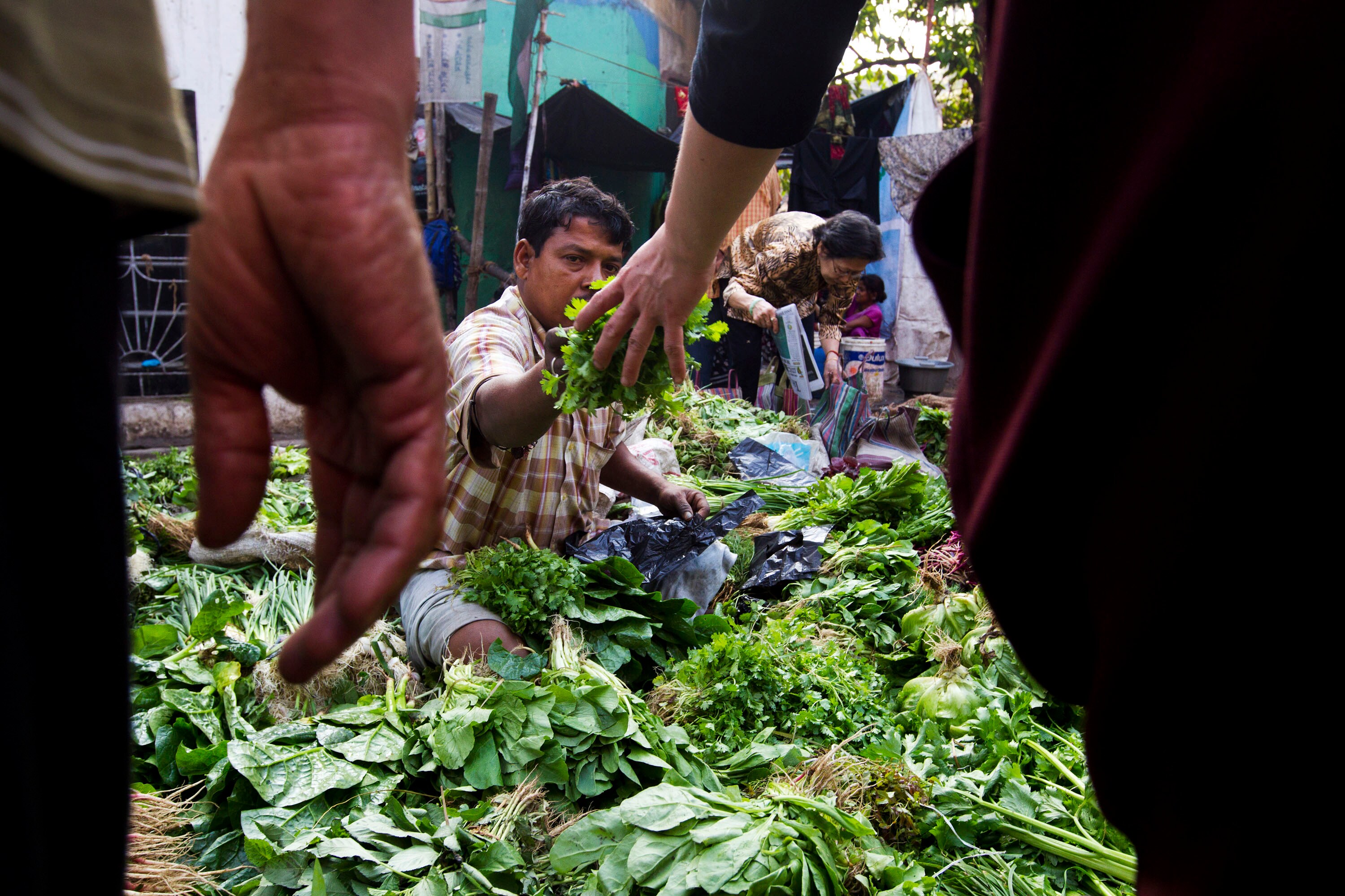 A customer purchases vegetables at a market in Kolkata, India. (Photographer: Brent Lewin/Bloomberg)