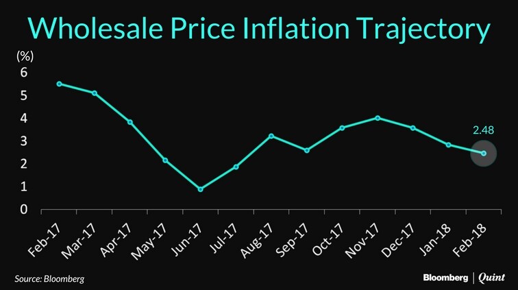 Inflation measured by the Wholesale Price Index stood at 2.48 percent last month, compared with 2.84 percent in January, according to a statement by the Ministry of Commerce and Industry. That's marginally lower than the 2.50 percent median estimate of economists surveyed by Bloomberg.