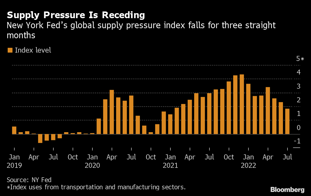 The easing of logistical logjams is also contributing to lower prices. The New York Fed's index of global supply-chain pressure has dropped to the lowest level since early 2021. Short-term shipping rates are falling, transit times across oceans are shortening, and companies are even starting to moan about bloated inventories.