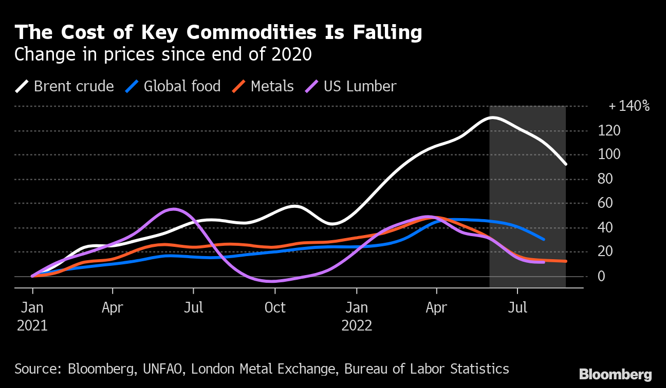 As economic growth slows, prices for key raw materials — from oil to copper and wheat — have cooled in recent weeks, taking pressure off the cost of manufactured goods and food. And it's getting cheaper to move those things around, as supply chains slowly recover from the pandemic.