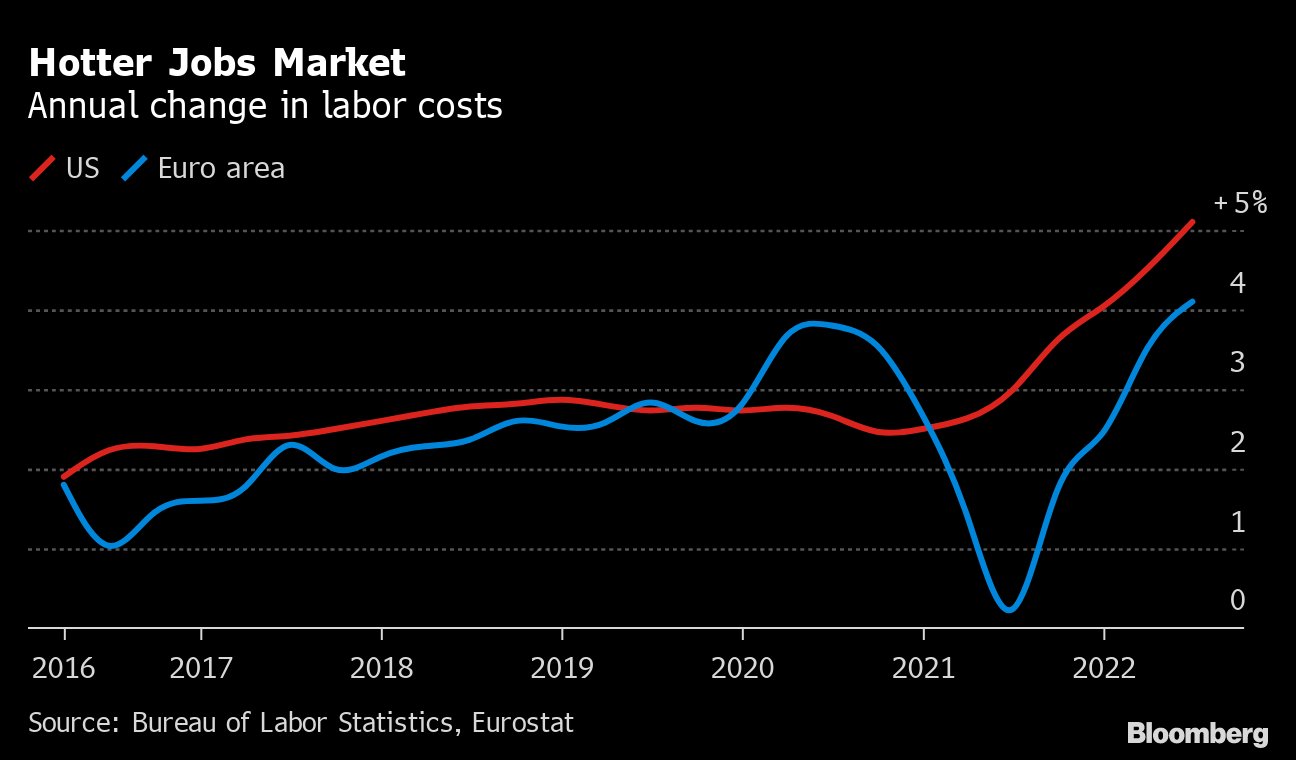 In fact, European wages have been rising more slowly than American ones, even though prices are now rising faster. That's another sign that inflation is taking a bigger bite out of living standards in Europe than in the US, where many workers got a pay bump in tight pandemic labor markets.