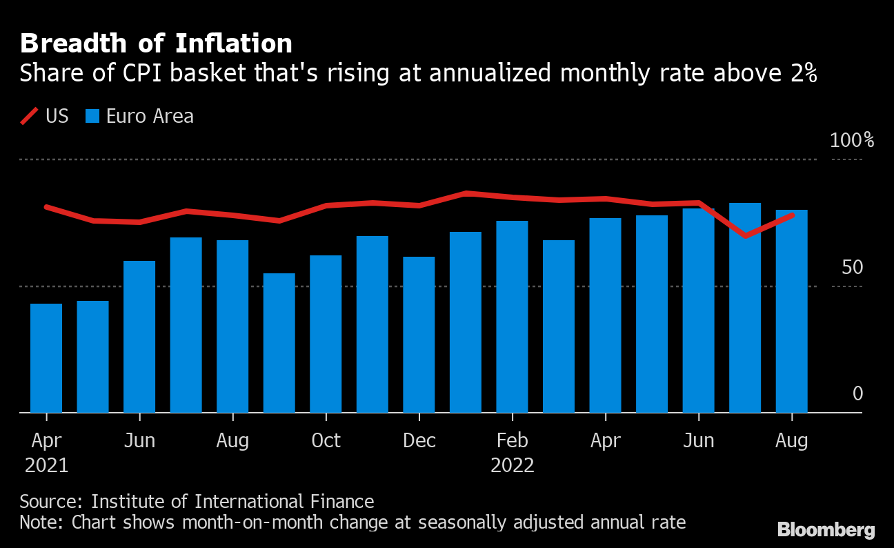 Euro-area price increases have now outpaced the US for two straight months. The gap likely widened in September, when Europe-wide inflation hit 10% while in Germany it accelerated to 10.9%. US numbers aren't due out for another 10 days.