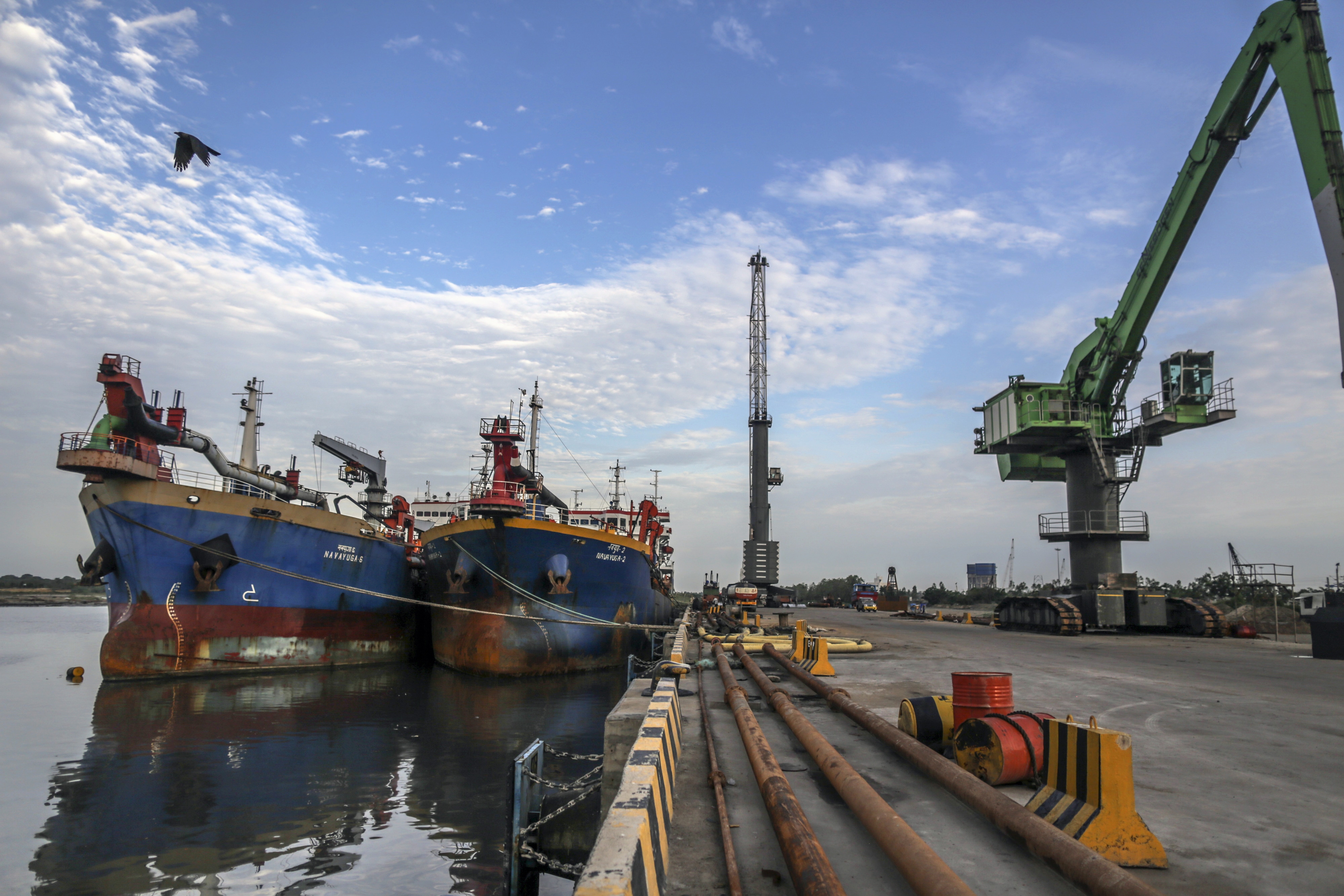 The Navayuga 6, left, and the Navayuga 2, dredgers sit docked at Krishnapatnam Port in Krishnapatnam, Andhra Pradesh, India. (Photographer: Dhiraj Singh/Bloomberg)
