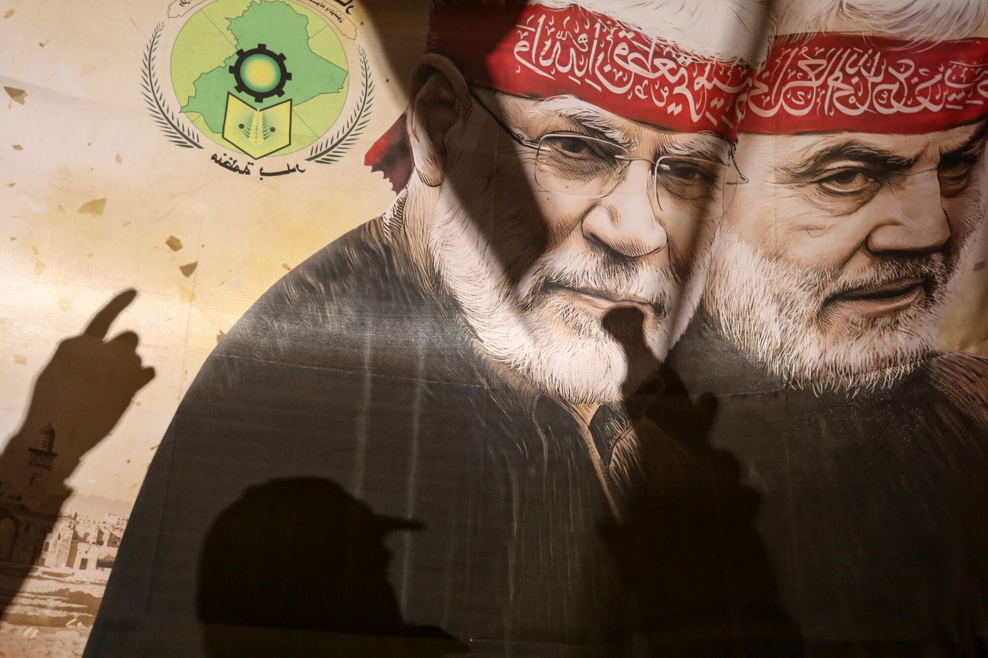 Supporters of pro-Iran factions in front of a poster of killed top Iranian commander Qasem Soleimani (R) and Iraqi commander Abu Mahdi al-Muhandis, in Baghdad in Iraq, on Jan. 13, 2024. Photographer: Murtaja Lateef/AFP/Getty Images