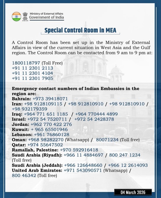 Randhir Jaiswal, official Spokesperson, Ministry of External Affairs, said that a special control room has been set up in the Ministry of External Affairs in view of the current situation in West Asia and the Gulf region. The control room can be contacted from 9 a.m. to 9 p.m.