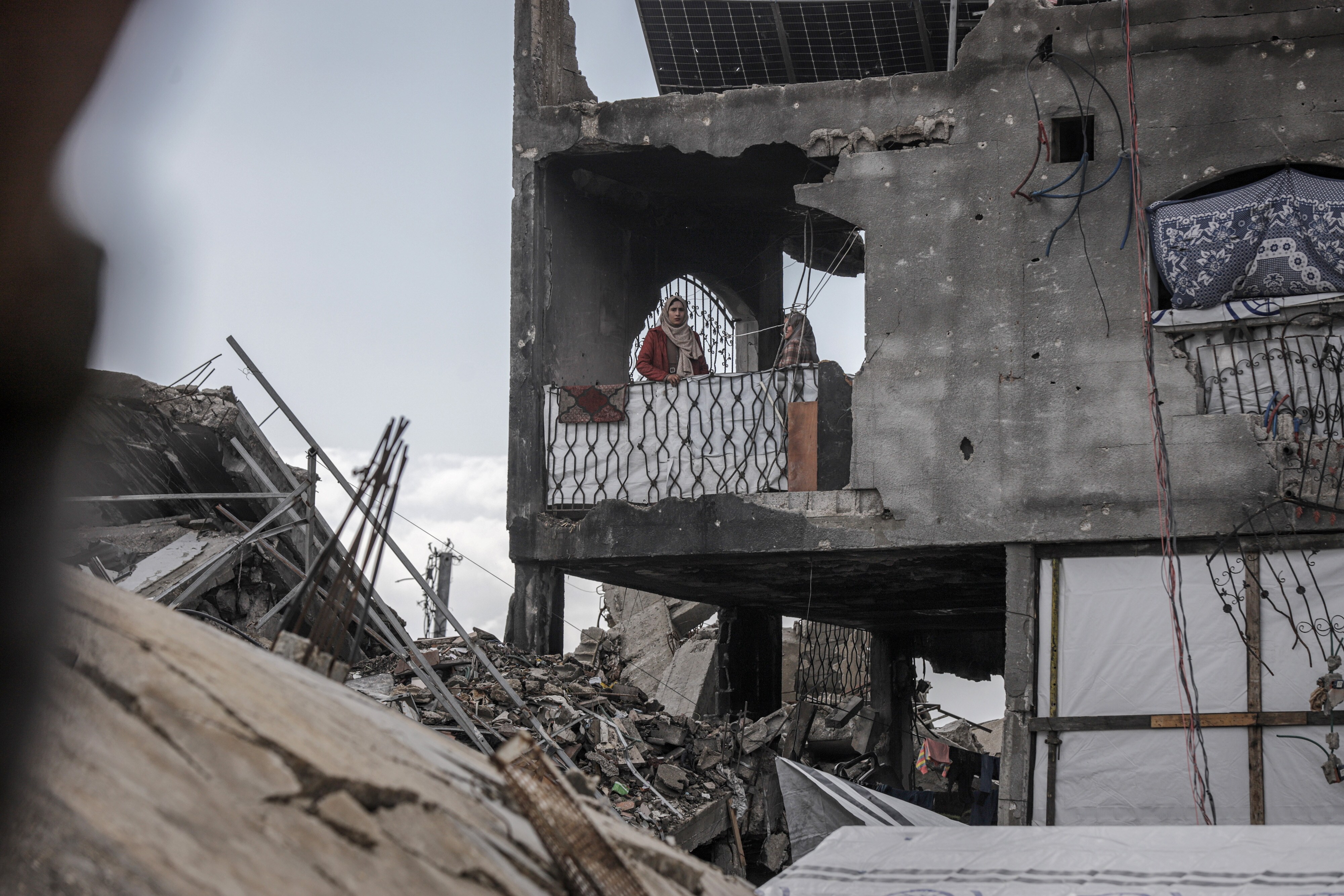 Displaced Palestinians living amongst destroyed buildings in the Jabaliya refugee camp in northern Gaza, on Feb. 13 (Photographer: Ahmad Salem/Bloomberg)