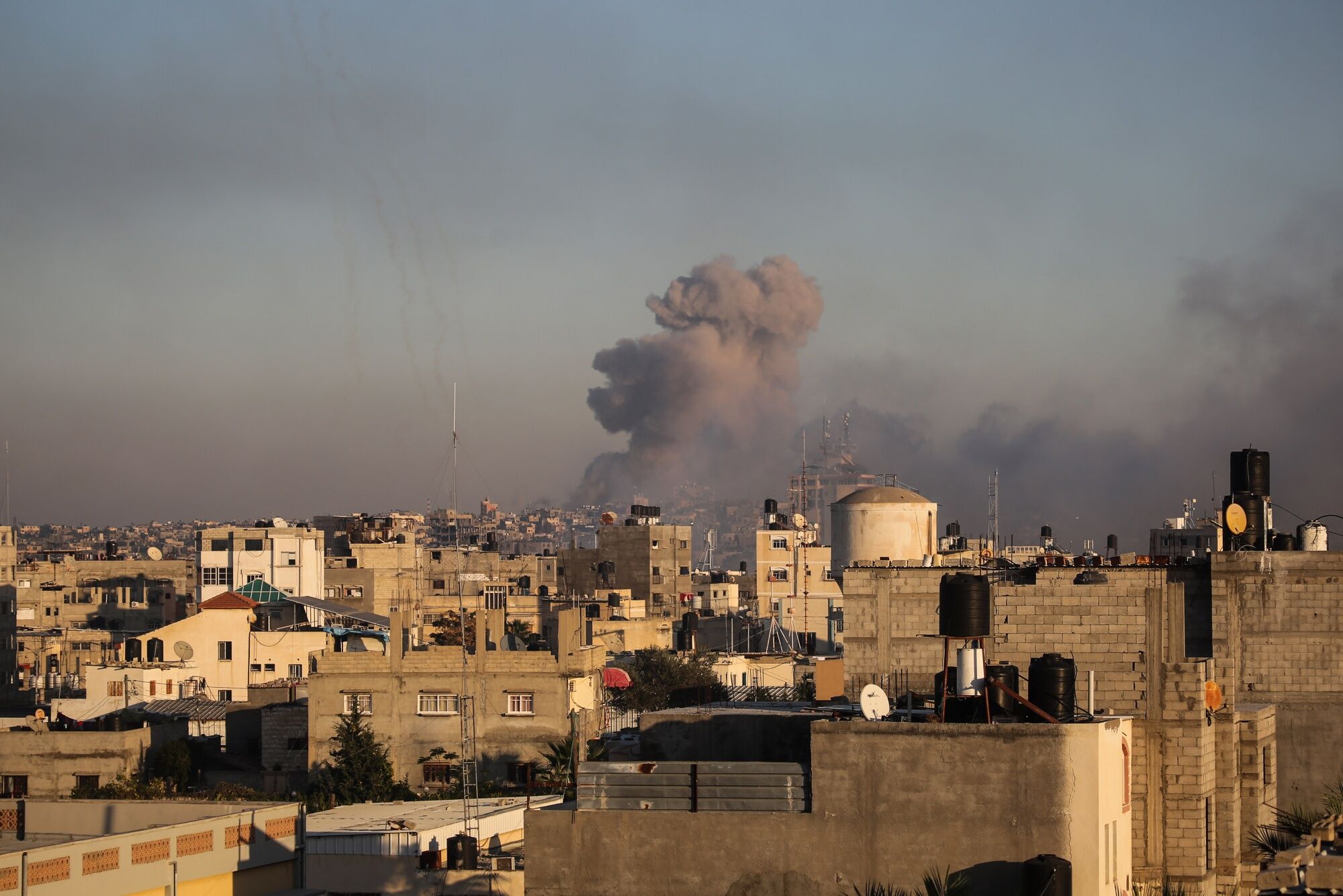 KHAN YUNIS, GAZA - DECEMBER 15: Smoke rising from Israeli air strikes on the city of Khan Yunis on December 15, 2023 in Khan Yunis, Gaza. World Health Organisation's Executive Board adopted a rare resolution on access for life-saving aid into Gaza and respect for laws of war, with the UN health chief reiterating an immediate ceasefire as "nowhere and no one is safe" in Gaza. (Photo by Ahmad Hasaballah/Getty Images)