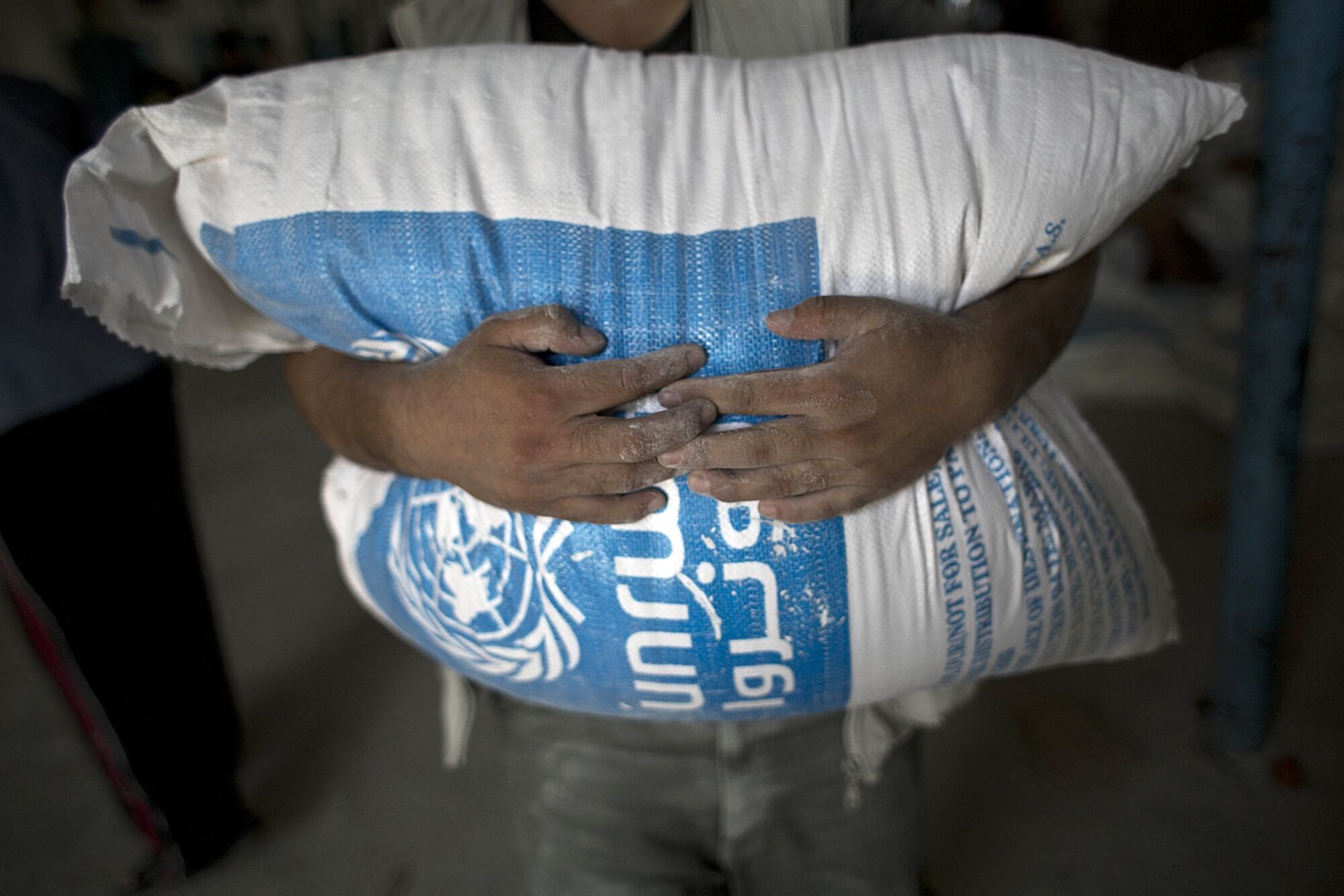 A Palestinian resident carries a bag of wheat flour distributed at a United Nations Relief and Works Agency center in Rafah, Gaza. Photographer: Said Khatib/AFP/Getty Images