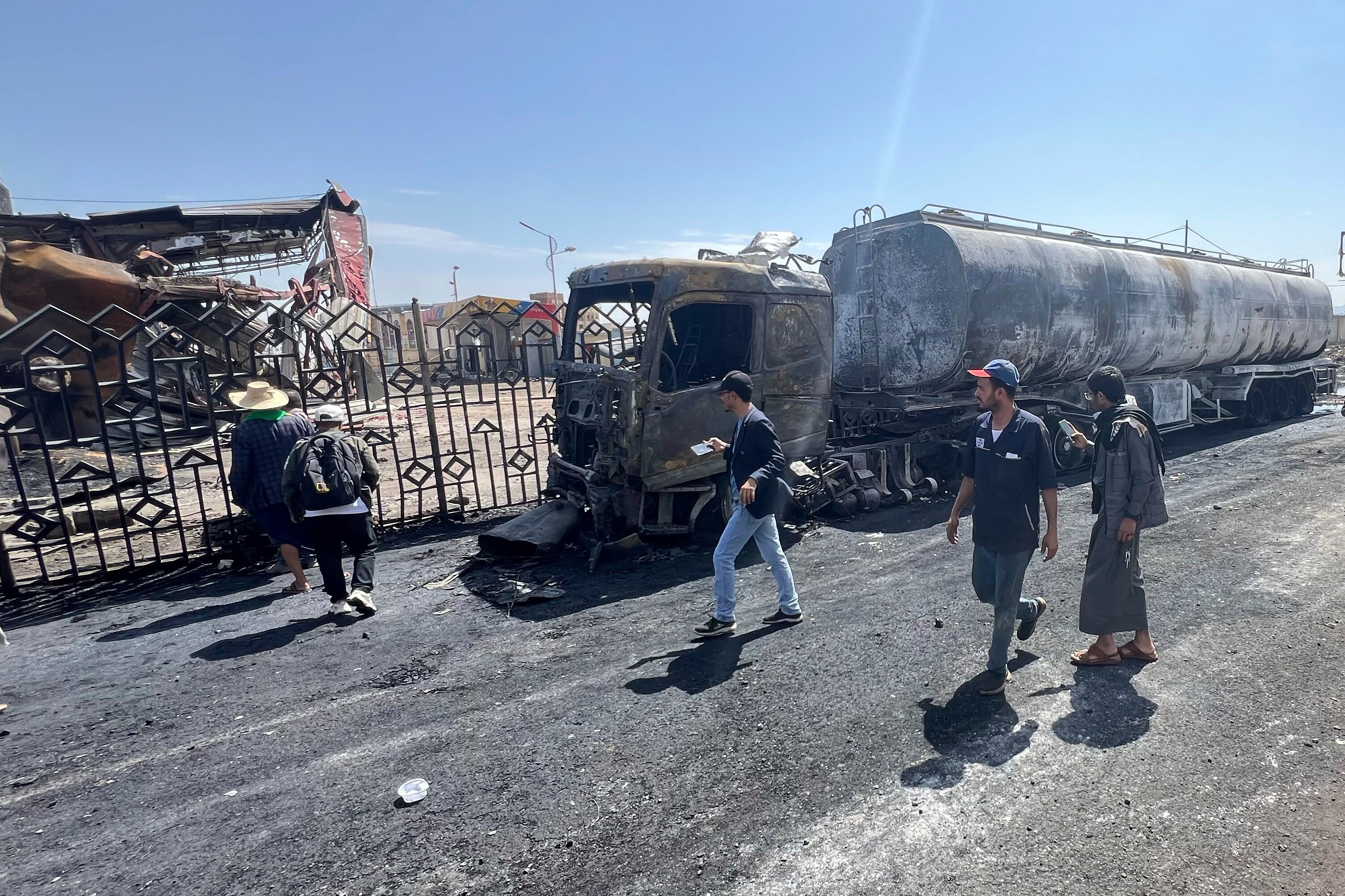 People watch damaged vehicles and buildings a day after Israeli airstrikes on the main gas station in Sanaa, Yemen, Monday, Aug. 25, 2025. (Photo: AP via PTI)