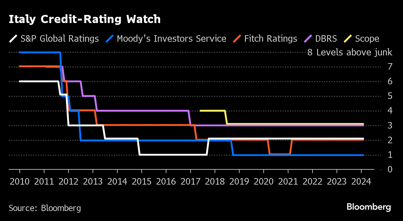 (Bloomberg) -- Italy's credit status remains intact at S&P Global Ratings, which enacted the first major scrutiny on a worsened trajectory for debt foreseen by Premier Giorgia Meloni's government.
