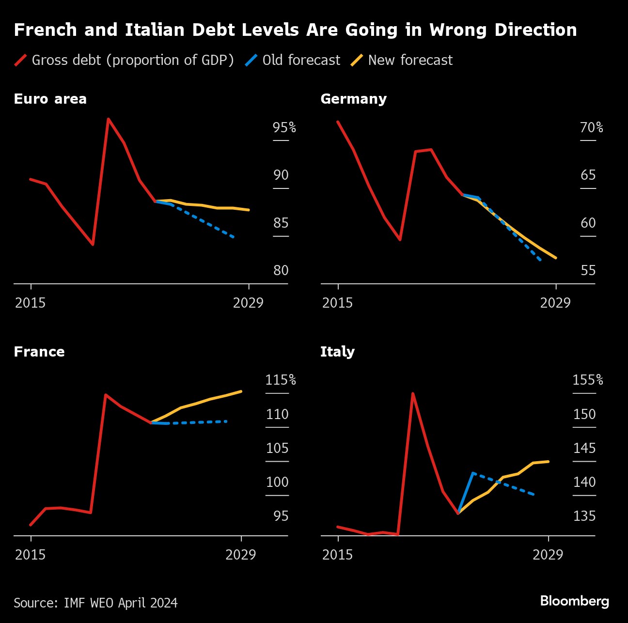 The government's recently published forecasts acknowledged a change in direction too. They indicate Italy's debt pile will peak at 139.8% of output in 2026, while the IMF reckons that it will breach 140% as soon as next year.