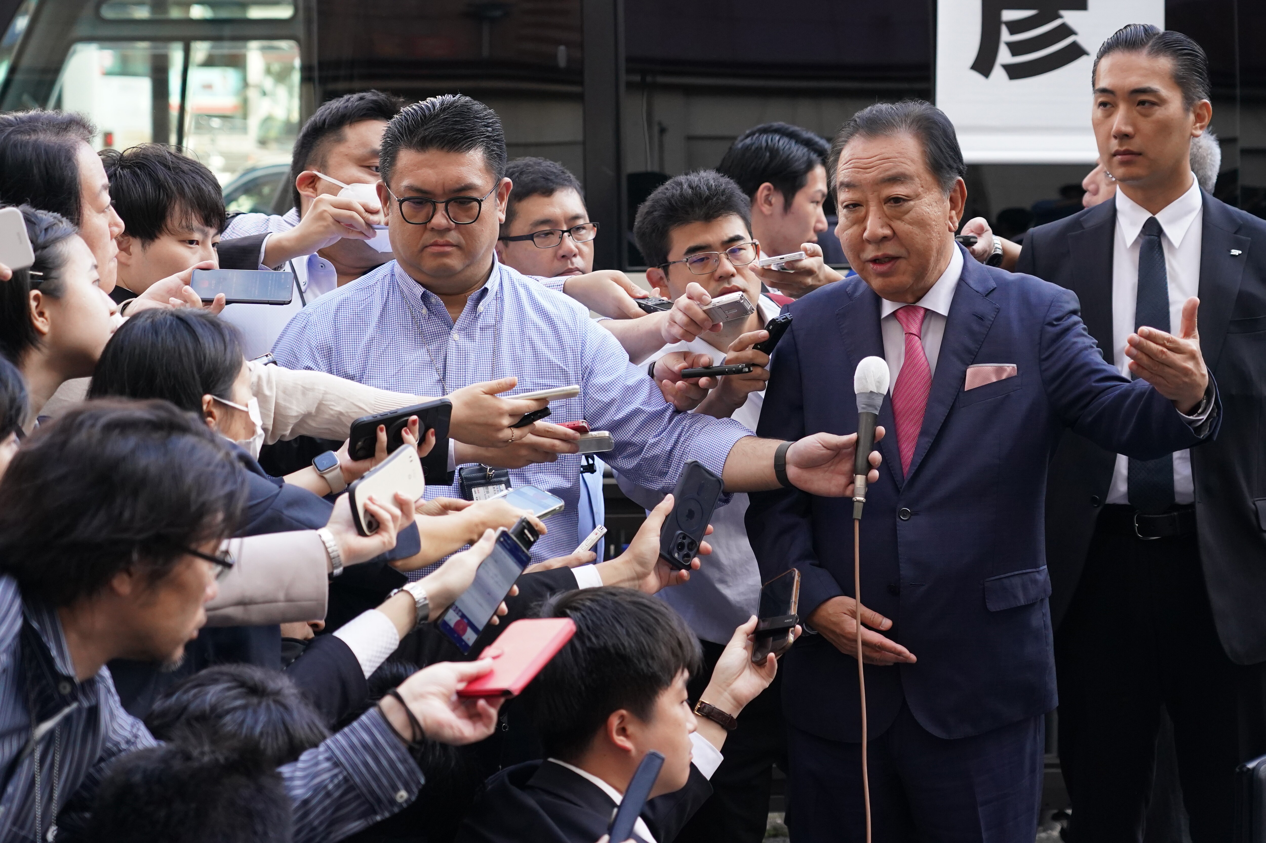 Yoshihiko Noda speaks to members of the media in Hachioji on Oct. 15.